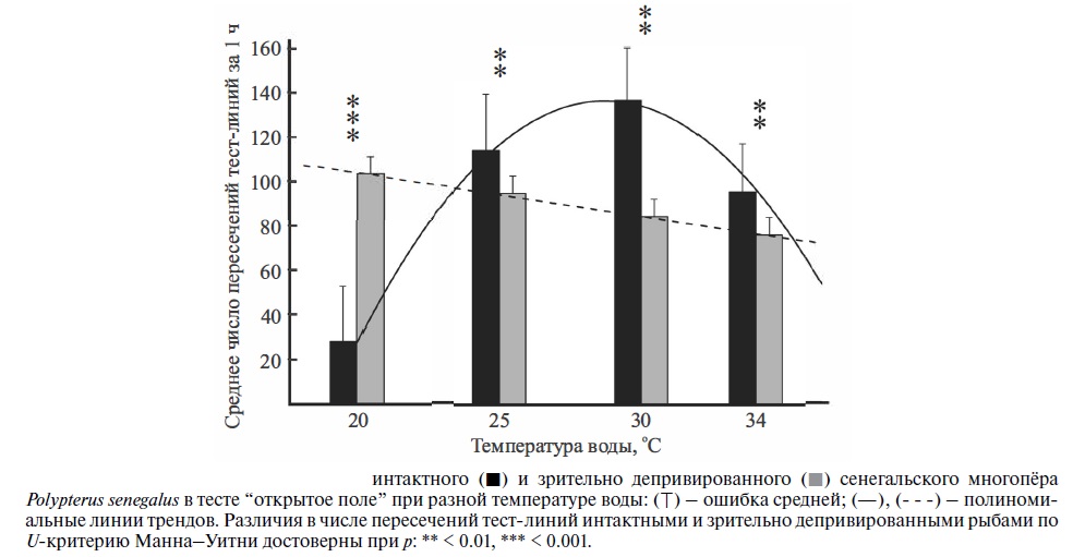 Впервые оценена двигательная активность интактного и зрительно депривированного сенегальского многопёра Polypterus senegalus при разной температуре воды (20, 25, 30 и 34°С). С использованием метода “открытое поле” показано, что у интактных рыб с ростом температуры двигательная активность повышается (наиболее быстро в интервале 20–25°С) и достигает максимума при температуре 30°С, которая может быть близкой к температурному оптимуму (или соответствовать ему) для сенегальского многопёра. У зрительно депривированных рыб двигательная активность максимальна при 20°С и с повышением температуры монотонно снижается, все показатели двигательной активности (частота пересечений тест-линий; время, затраченное на пересечение тест-линии; проплываемое рыбой расстояние, скорость плавания) у зрительно депривированных рыб варьируют слабее, чем у интактных. Обнаруженные различия в поведении интактных и зрительно депривированных рыб указывают на наличие функциональной взаимосвязи между зрением и двигательной активностью у эволюционно древних Cladistia.