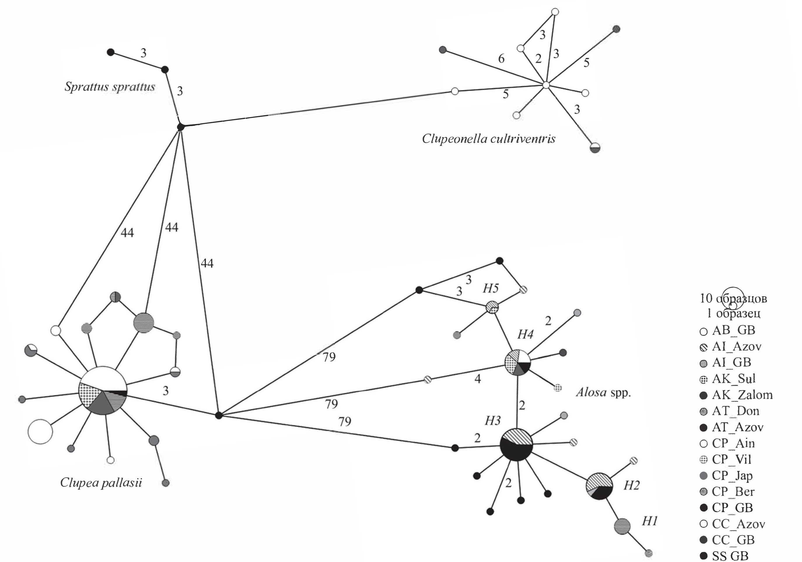 Рис. 1. Сеть гаплотипов, основанная на полиморфизме гена COI в исследованных образцах сельдевидных (Clupeoidea): H1–H5 – общие гаплотипы у видов рода Alosa; у соединяющих гаплотипы линий указано число нуклеотидных замен (если не указано, это число равно 1). Здесь и на рис. 2: характеристики выборок см. в табл. 1.