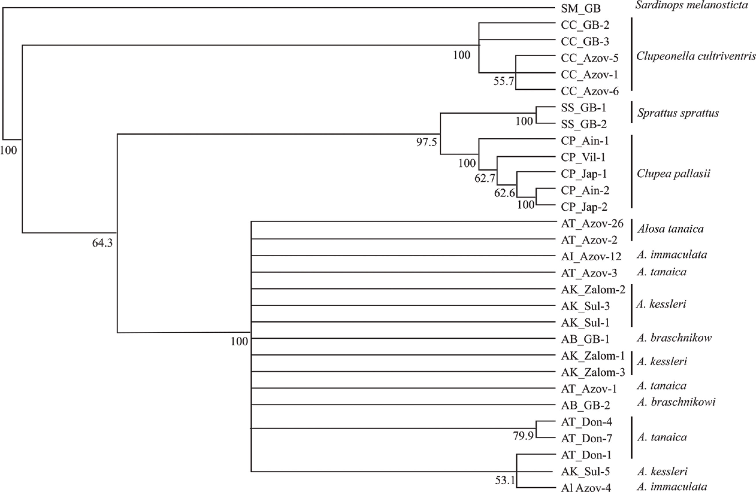 Обнаружено, что один и тот же гаплотип H4 встречается у всех четырёх видов рода Alosa. Гаплотип Н2 встречается у A. immaculata и A. tanaica, а гаплотип Н5 – у A. immaculata и A. kessleri. Эти данные свидетельствует об отсутствии генетической дифференциации исследованных видов сельдей рода Alosa на отдельные виды и группы видов при использовании ДНК-штрихкодирования с использованием нуклеотидных последовательностей гена COI. На основании анализа нуклеотидных последовательностей 30 образцов разных видов сельдевидных построено филогенетическое дерево с бутстреп-поддержкой (рис. 2), которое не позволило выявить межвидовую дифференциацию у исследованных сельдей рода Alosa. В одну группу со 100%-ной бутстреп-поддержкой попали все исследуемые виды сельдей.
