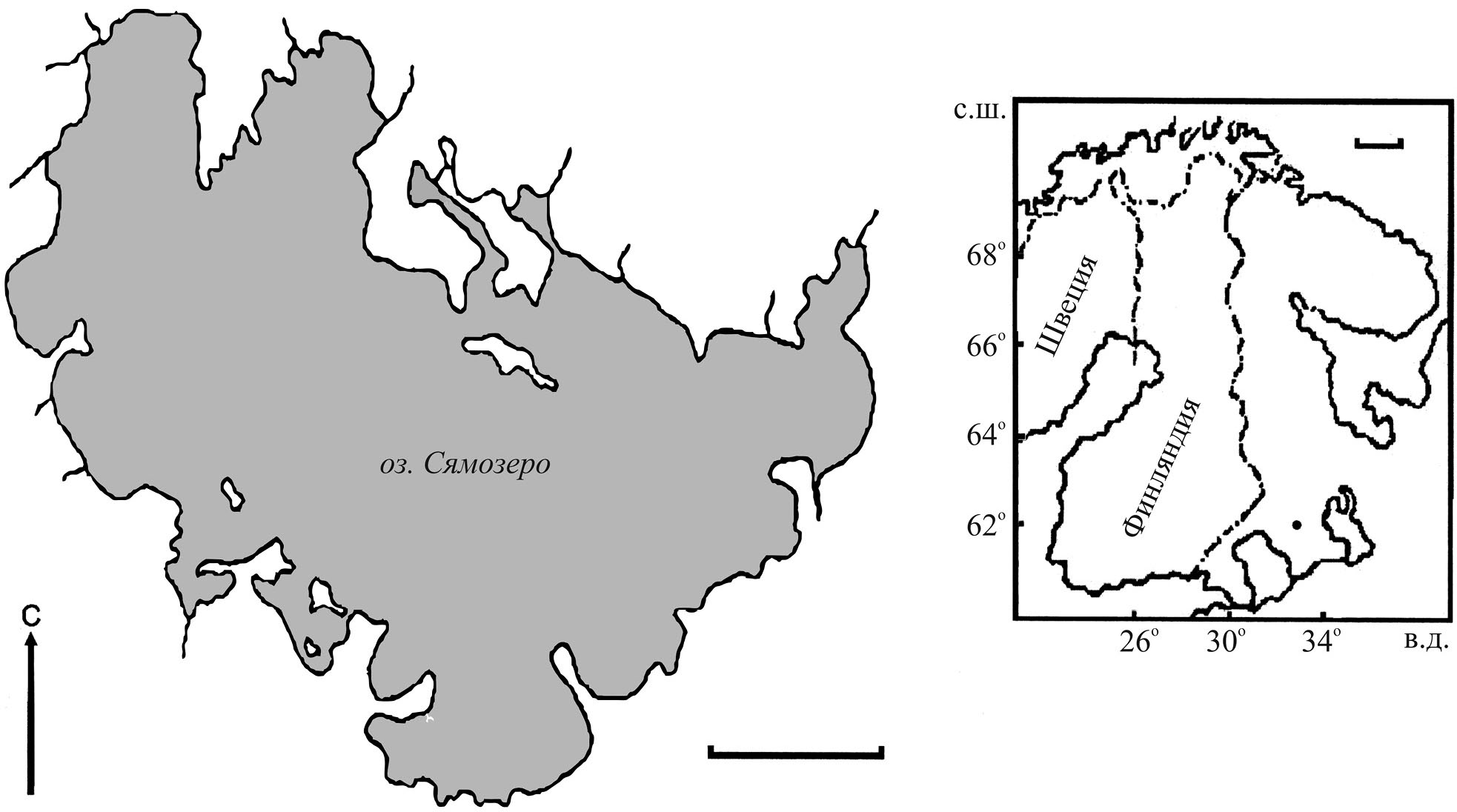 Рис. 1. Карта-схема оз. Сямозеро (●). Масштаб, км: основная карта – 200, выноска – 5.