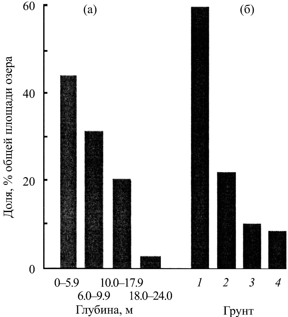 Рис. 2. Распределение площадей озера по глубинам (а) и по типу грунта (б): 1 – ил, 2 – руда, 3 – глина, 4 – глина и песок.