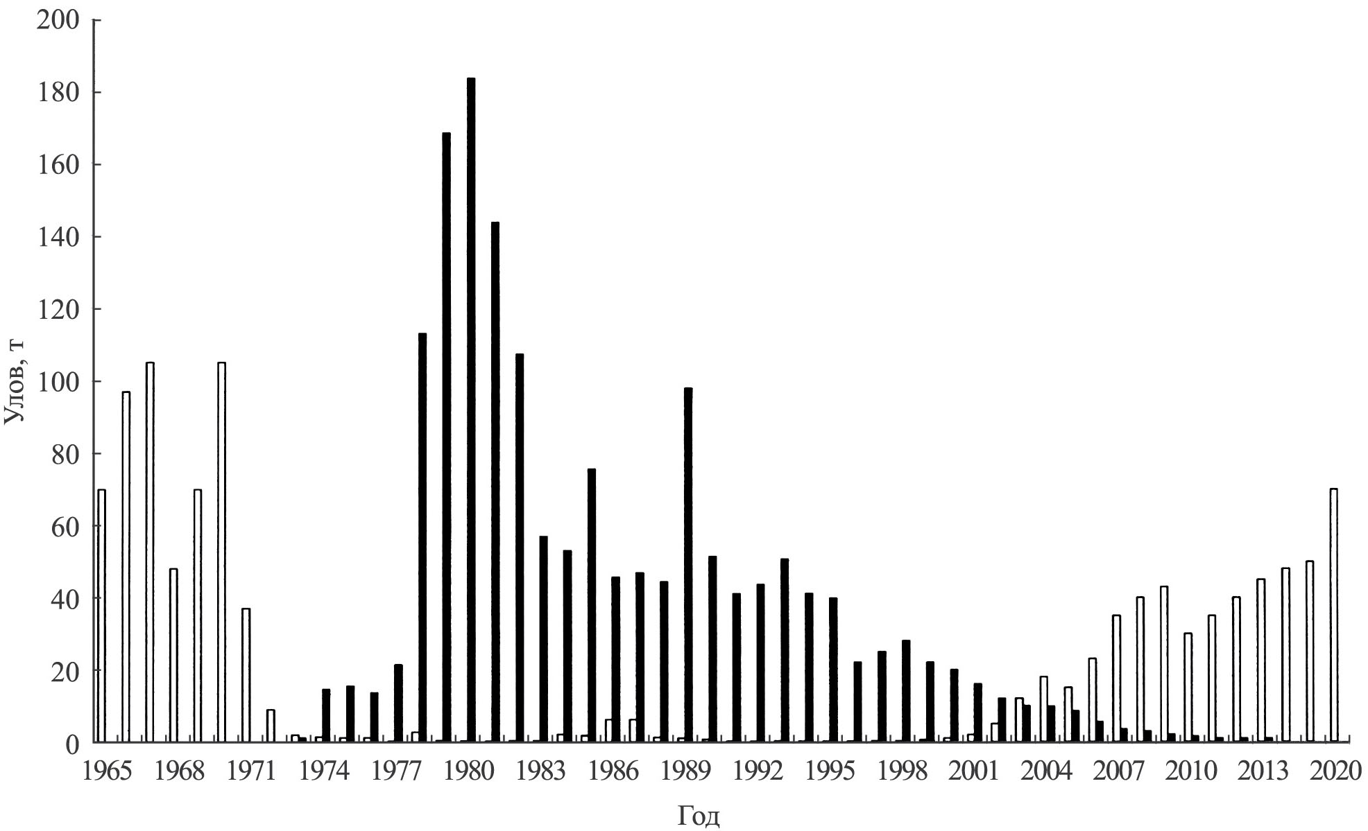 Рис. 3. Динамика годовых уловов при промысле ряпушки Coregonus albula (□) и корюшки Osmerus eperlanus (■) в оз. Сямозеро.