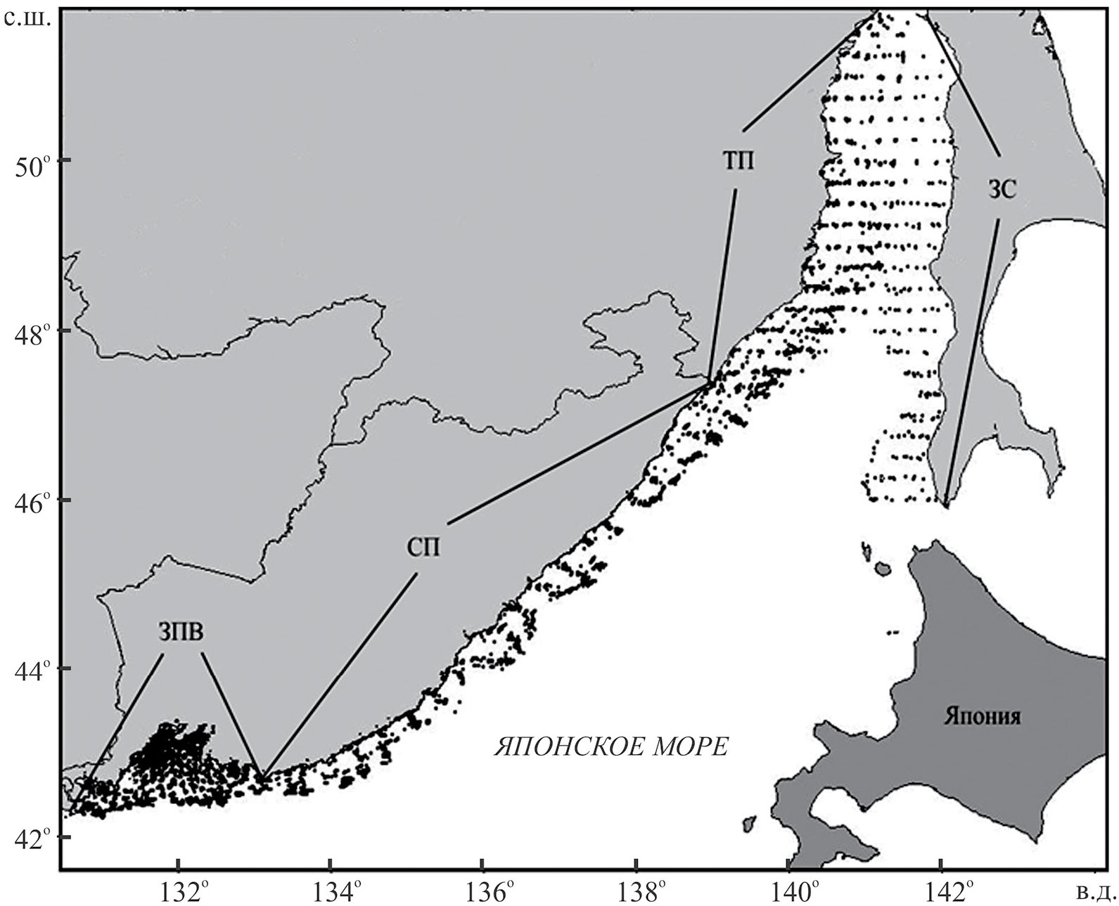 Материалом послужили данные донных траловых съёмок на шельфе и материковом склоне северной части Японского моря в рейсах научно-исследовательских судов ТИНРО в 1978–2018 гг. Акватория была подразделена на четыре района: зал. Петра Великого (ЗПВ) – от р. Туманная до м. Поворотный, Северное Приморье (СП) – от м. Поворотный до м. Золотой, воды у материкового побережья Татарского пролива (ТП) – от м. Золотой до прол. Невельского и Западный Сахалин (ЗС) – у островного побережья Татарского пролива от прол. Невельского до м. Крильон (рис. 1). Обследованы глубины 20–750 м (в зал. Петра Великого – от 2 м). При анализе сезонного распределения проводили деление на гидрологические сезоны по классификации Зуенко (1994): зимний период включает январь и февраль, весенний – март и апрель, летний – июнь–сентябрь, осенний – ноябрь и декабрь. Май является переходным месяцем между весенним и летним сезонами, октябрь – между летним и осенним. Май мы отнесли к весеннему сезону, октябрь – к осеннему.