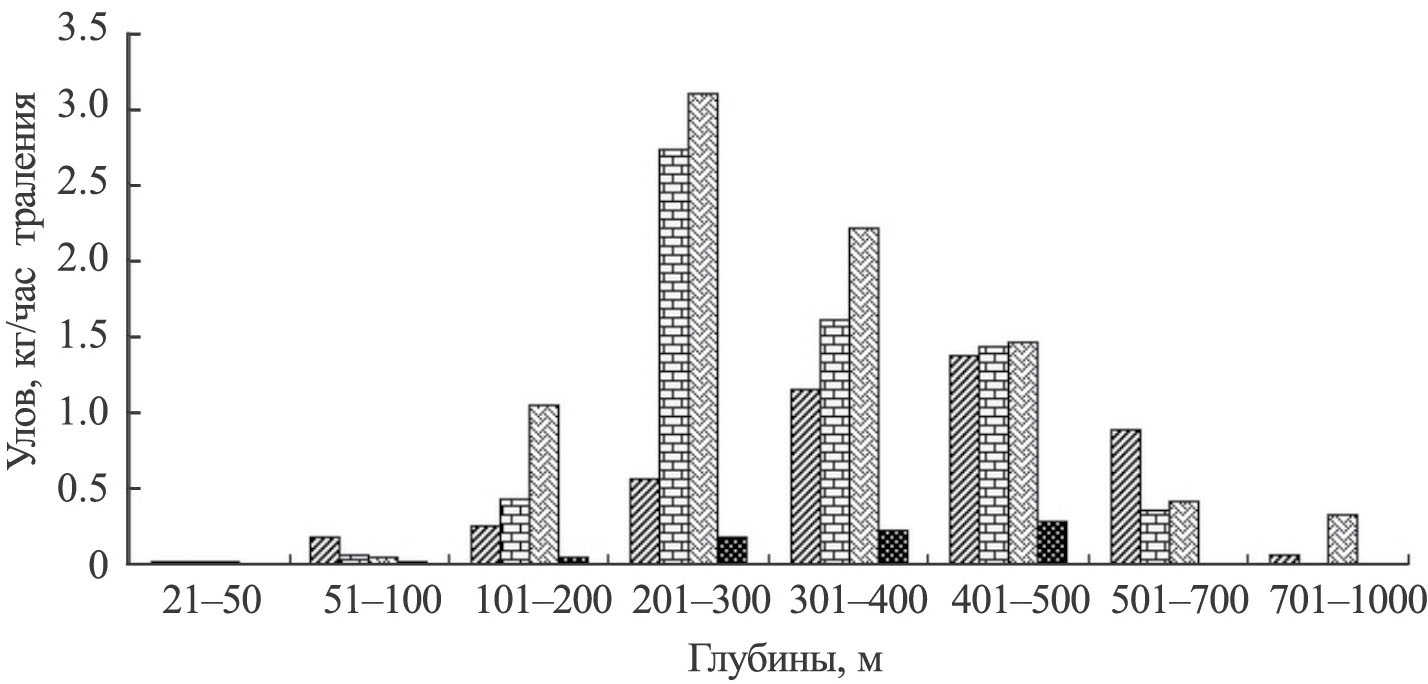Рис. 2. Распределение уловов кристаллинового липариса Crystallias matsushimae в российских водах Японского моря по глубинам в разные сезоны 1978–2018 гг.: (▨) – весна, (▦) – лето, (▧) – осень, (▩) – зима.