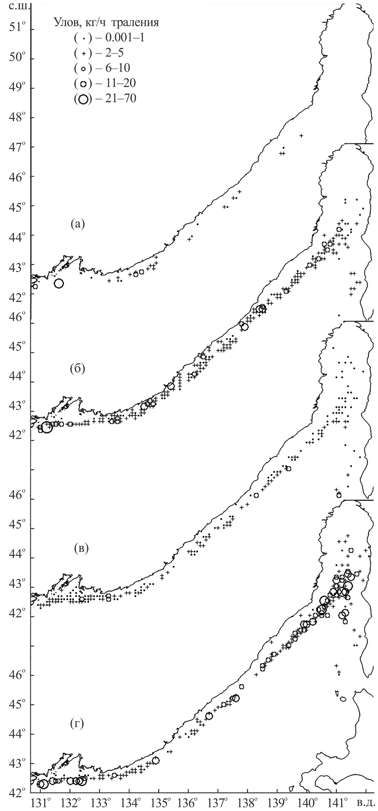 На зимний период приходилось наименьшее число тралений, поэтому картина распределения в это время года не охватывает значительную часть исследуемой акватории (рис. 3а). Вид встречался во всей акватории Северного Приморья, но высокие уловы отмечались в западной части зал. Петра Великого. Татарский пролив как с материковой, так и с островной стороны не был охвачен тралениями зимой.