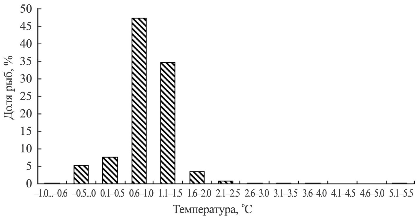 Зависимость распределения от температуры придонного слоя воды. Кристаллиновый липарис является стенотермным видом. Отдельные его поимки были зафиксированы при температуре воды от –0.8°C в феврале на шельфе зал. Петра Великого до 5.4°C в водах Северного Приморья. Однако в основном он держался в узком диапазоне температур, более 80% его поимок находилось в границах одного градуса – от 0.6 до 1.5°C (рис. 4).