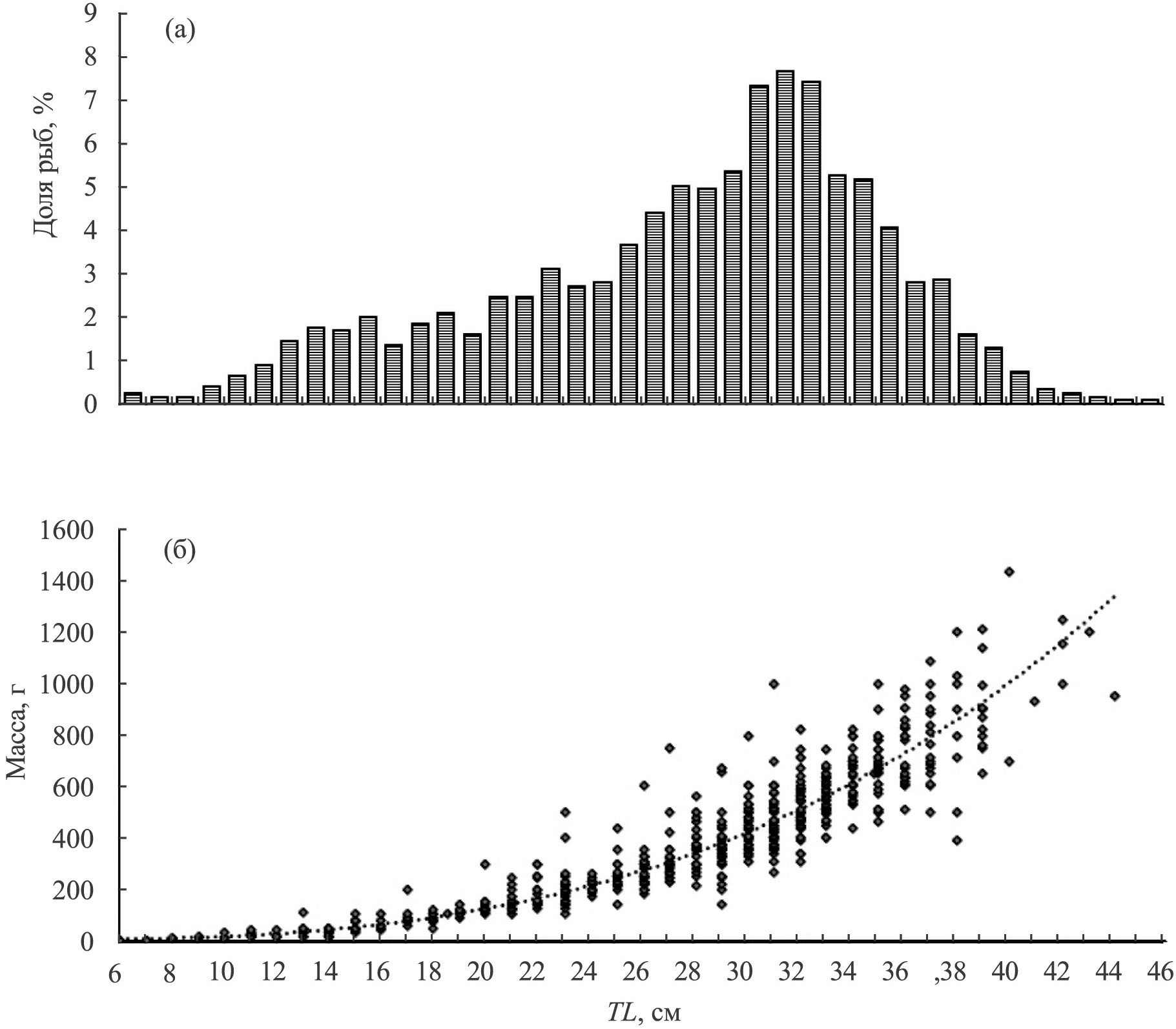 Размерный состав. В уловах донного трала встречались особи кристаллинового липариса TL 6–45 см. Модальную группу составляли рыбы TL 30–32 см (рис. 5а). Зависимость длина–масса у этого вида из вод Японского моря описывалась уравнением: W = 0.0141TL3.0292 (R² = 0.937), где W – масса рыбы, г; TL – общая длина, см (рис. 5б).