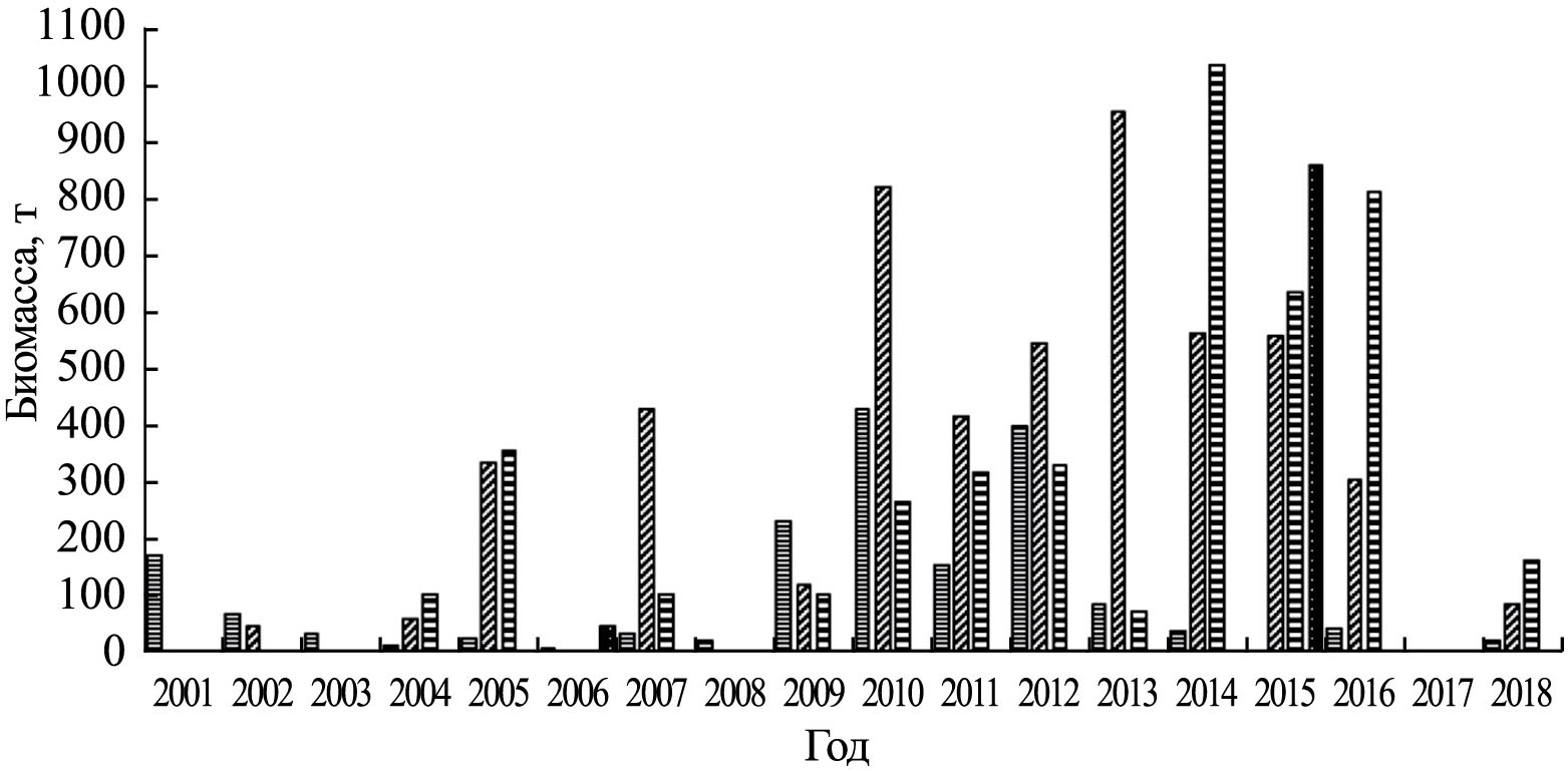 Многолетняя динамика биомассы. Средняя биомасса кристаллинового липариса в разных районах с начала 2000-х гг. находилась примерно на одинаковом уровне – 350–450 т. Максимальные оценки запасов в Северном Приморье и у Западного Сахалина превышали 800 т, а в 2014 г. вдоль материкового побережья Татарского пролива достигали 1033 т (рис. 6). В зал. Петра Великого и среднее, и максимальное значения оценки запасов были гораздо ниже – соответственно 108 и 426 т. С начала 2000-х гг. наблюдалось увеличение биомассы кристаллинового липариса в северной части Японского моря, в зал. Петра Великого пик приходился на 2010–2012 гг., в остальных районах – на 2013–2016 гг.