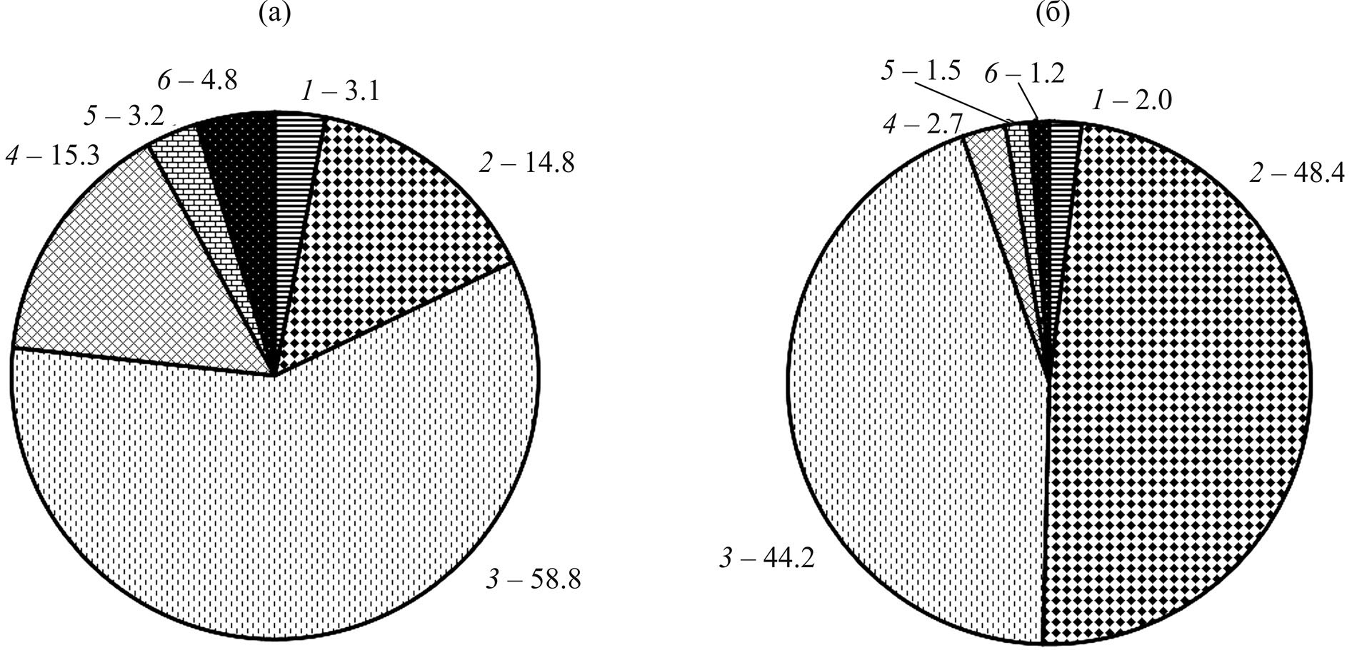 Рис. 7. Состав пищи (% массы) кристаллинового липариса Crystallias matsushimae на шельфе (а) и материковом склоне (б) Северного Приморья в апреле–мае: 1 – Polychaeta, 2 – Amphipoda, 3 – Mysida, 4 – Decapoda, 5 – Pisces, 6 – прочие.