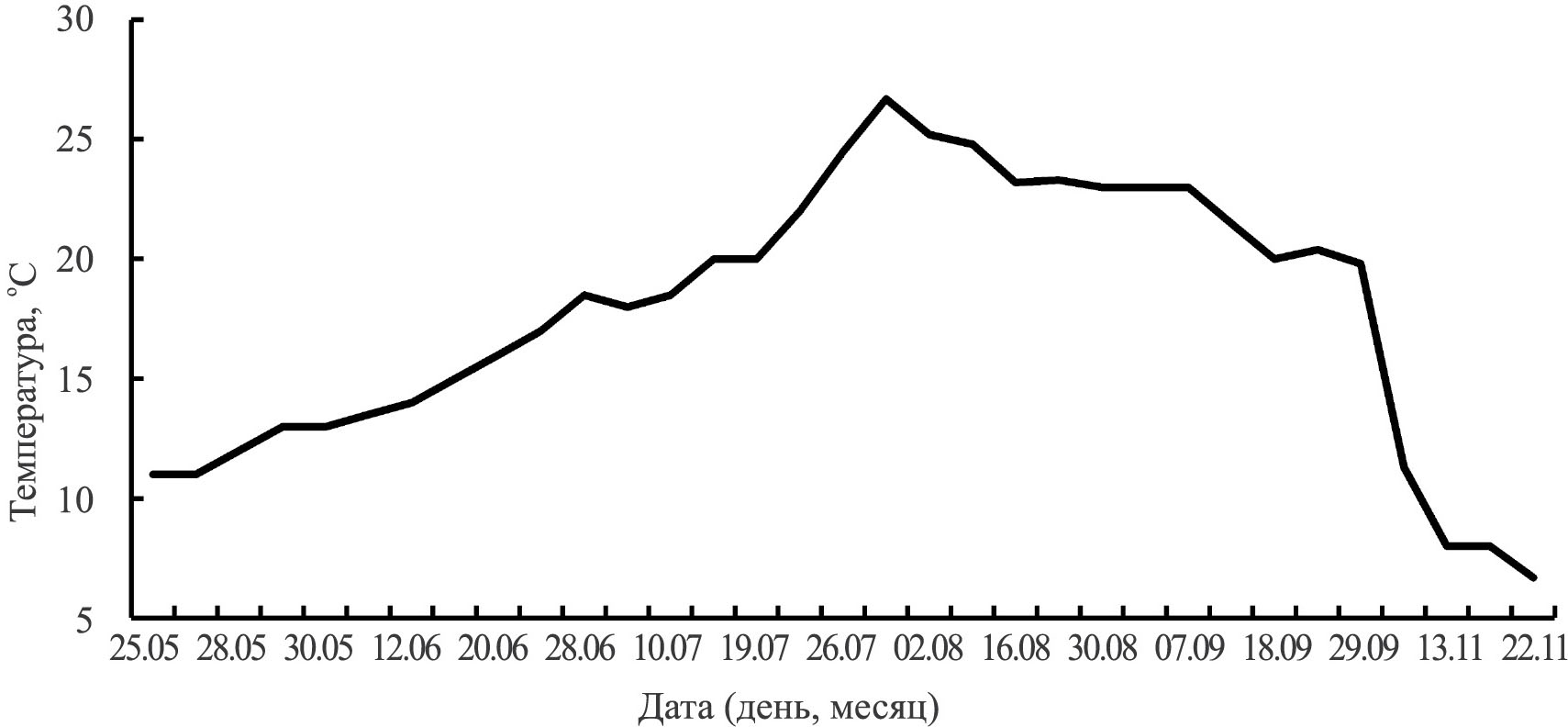 Рис. 1. Температура воды у дна на трансекте в зарослях Zostera marina в мае–сентябре и ноябре 2021 г.