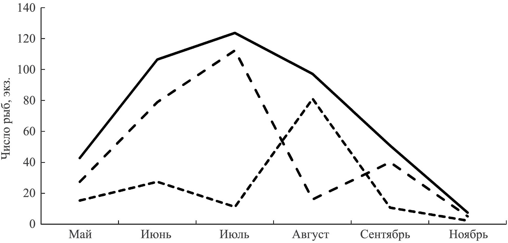 Рис. 2. Сезонное изменение числа рыб на трансектах в 2021 г. в зарослях: (– –) – Zostera marina, (– – -) – Ulva fenestrata; (―) – суммарно на двух трансектах.