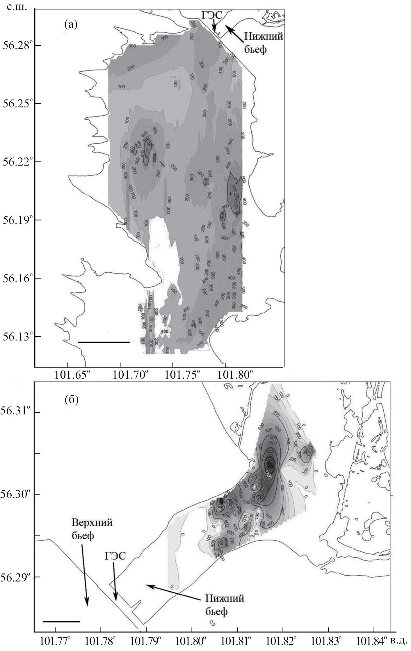 Вызывает сомнение сама возможность массового ската рыб, которые по своим физическим показателям способны противостоять стоковому течению. Наши наблюдения на речных плёсах Горьковского, Рыбинского, Иваньковского и Угличского водохранилищ на участках с выраженным стоковым течением (Поддубный и др., 2003) показали, что рыбы в основном приурочены к участкам пониженных скоростей (< 15 см/с) на периферии оси стокового течения. Такие виды рыб, как окунь и судак Sander lucioperca, уходят из зоны больших скоростей в зону скоростей 0.10–0.25Vкр (Vкр – критическая скорость, т. е. скорость потока, которой особь определённого вида и размера не способна сопротивляться). Эти скорости для указанных видов при Vкр 40–60 см/с, составили от 4 до 15 см/c. Более низкие скорости течения выбирала и плотва. Предпочитаемые ею скорости составляли ∼0.49Vкр, т. е. ∼20 см/с (Поддубный и др., 2003). Подобная реакция на течение способствует относительной стабильности распределения рыб в реке и позволяет адекватно реагировать на иные факторы среды (распределение корма, хищников и так далее). Это же подтвердили наши исследования на Чебоксарской ГЭС (Герасимов и др., 2014), которая работала только в дневные часы, а в ночное время сброс воды через ГЭС не производился. По данным гидроакустических исследований, ночью рыбы в верхнем бьефе для нагула выходили на русловые участки с максимальными глубинами (рис. 6а). Утром, перед запуском агрегатов ГЭС, рыбы смещались на участки за пределами русла с глубинами не более 10 м (рис. 6б), где стоковое течение имело минимальные скорости. То есть у рыб выработался определённый тип поведения, который позволял им противостоять скату в нижний бьеф плотины. Это же подтверждают данные по Братскому водохранилищу, показывающие, что максимальные плотности скоплений в акватории верхнего бьефа были отмечены у правого и левого берегов за пределами максимальных глубин, по которым проходит стоковое течение (рис. 1а). То же отмечено и в нижнем бьефе: плотные скопления смещены от стрежня к левому берегу, это обеспечивает длительную стабильность пространственного расположения скопления.