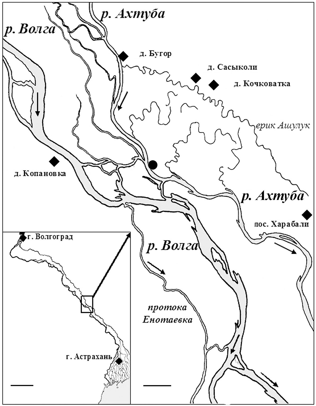 Рис. 1. Карта-схема района работ: (●) – местоположение полигона на левом берегу р. Ахтуба, (→) – направление течения, (♦) – населённые пункты. Масштаб, км: основная карта – 30, выноска – 3.