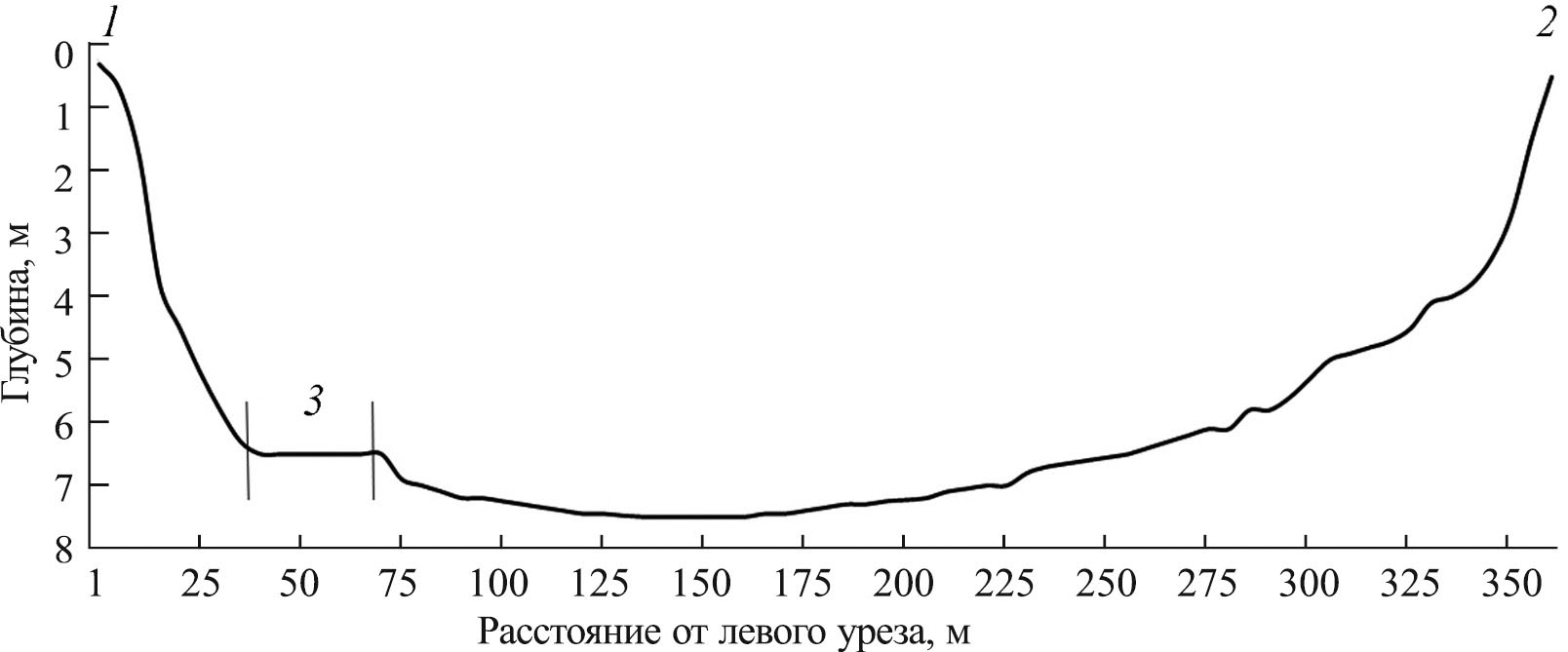 Полигон. Река в месте расположения полигона представляет собой плёс шириной 360 м (в межень 190–420 м), верхним краем примыкающий к русловой яме (глубина >20 м). Прибрежные заросли высшей водной растительности на полигоне и на удалении не менее 5 км вверх и вниз по течению отсутствуют. Речное ложе имеет резкий уклон, на удалении 35–40 м от левого берега глубина составляет 6.0–6.5 м, далее профиль ложа остаётся неизменным на протяжении ~ 30–35 м, образуя “полку”. Затем глубина постепенно нарастает, на середине реки она составляет 7.5 м и постепенно уменьшается в направлении противоположного пологого берега (рис. 2). Профиль ложа реки определяли с применением эхолотов Lowrance Gen3 Carbon (“Navico Inc.”, США) и Hummingbird HDSI (“Hummingbird Electronics Inc.”, Австралия), имеющих функцию картплоттера – построения двумерного изображения донного рельефа. Дно глинисто-песчаное, с большой долей песка у обоих берегов и резким преобладанием глины на глубинах ≥ 2 м. Скорость течения воды снижалась c 0.6 м/с в конце июня до 0.4 м/с в середине июля и до начала сентября.