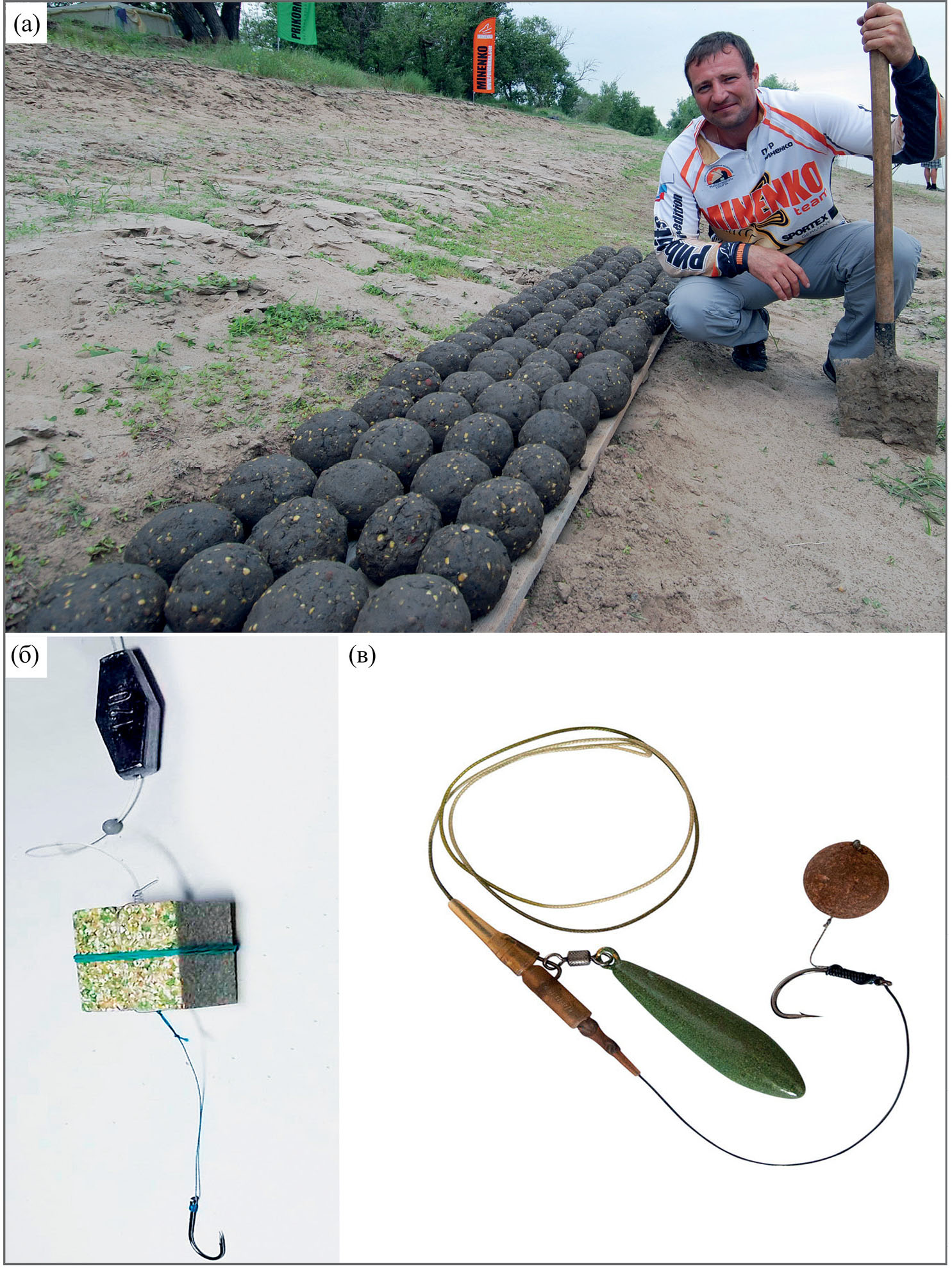 Приманка. Для привлечения сазана к полигону использовали прикормочные ядра-приманки, изготовленные из глиняно-зерновой смеси, состоявшей из зёрен кукурузы и пшеницы, подсолнечного шрота (= жмых или макуха) и сырой красной карьерной глины в объёмном соотношении 1 : 1 : 1 : 5 (рис. 4а). Кукурузу предварительно варили в течение 1 ч, пшеницу замачивали в речной воде (1 : 1) и использовали на третий день после выдерживания при температуре 20–25°C и появления характерного запаха брожения. Прессованный подсолнечный шрот размачивали в речной воде 5–10 мин. Готовые компоненты перемешивали, затем к 150–170 кг смеси добавляли 5 л концентрата свекольной патоки (= меласса). Смесь вновь тщательно перемешивали и формировали 80–90 ядер-приманок диаметром ~ 15 см и массой 1.5–2.0 кг каждое. После подсушивания на воздухе в течение 3–4 ч ядра-приманки сбрасывали с борта катера, равномерно распределяя их по всей площади полигона. Ядра-приманки вносили ежедневно в 14:00–15:00 начиная с 23.06.2018 г. Компоненты смеси хранили при температуре ≤ 10°C.
