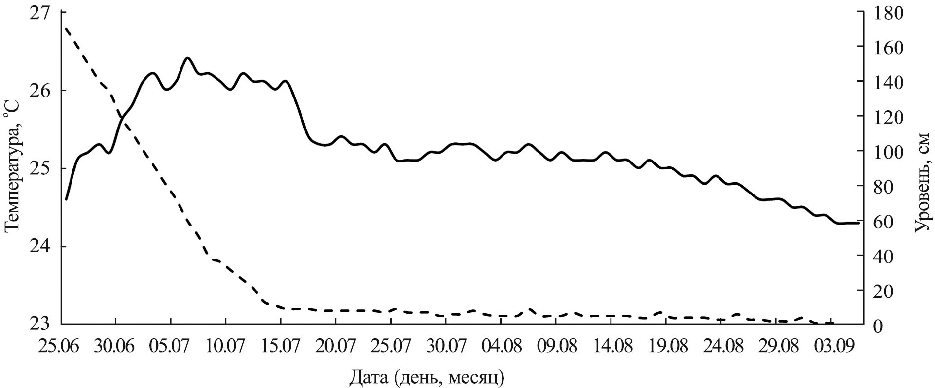 Гидрологический режим. В начале периода работ дневная температура воды в реке быстро повышалась и в первой половине июля достигла максимальных значений – 26.7°C. С конца второй декады июля температура очень медленно понижалась и к концу периода работ составляла чуть менее 25°C. Разница температуры воды на глубинах 0.8 и 5.0 м составляла не более 0.2°C во второй половине дня при максимальной дневной температуре воздуха и не различалась в ранние рассветные часы. Уровень воды в реке быстро и монотонно снижался до середины июля, перепад уровня за первые 3 нед. наблюдений составил > 150 см (рис. 5). С середины июля наступила летняя межень, когда уровень воды менялся незначительно, не более чем на 2–3 см в отдельные дни. Изменения уровня в р. Ахтуба обусловлены работой Волгоградской ГЭС. В период исследований состояние воды в реке оставалось примерно сходным, за исключением последней недели июля, когда наблюдалась вспышка численности фитопланктона, особенно в непроточных затонах и у берега (по визуальным оценкам).