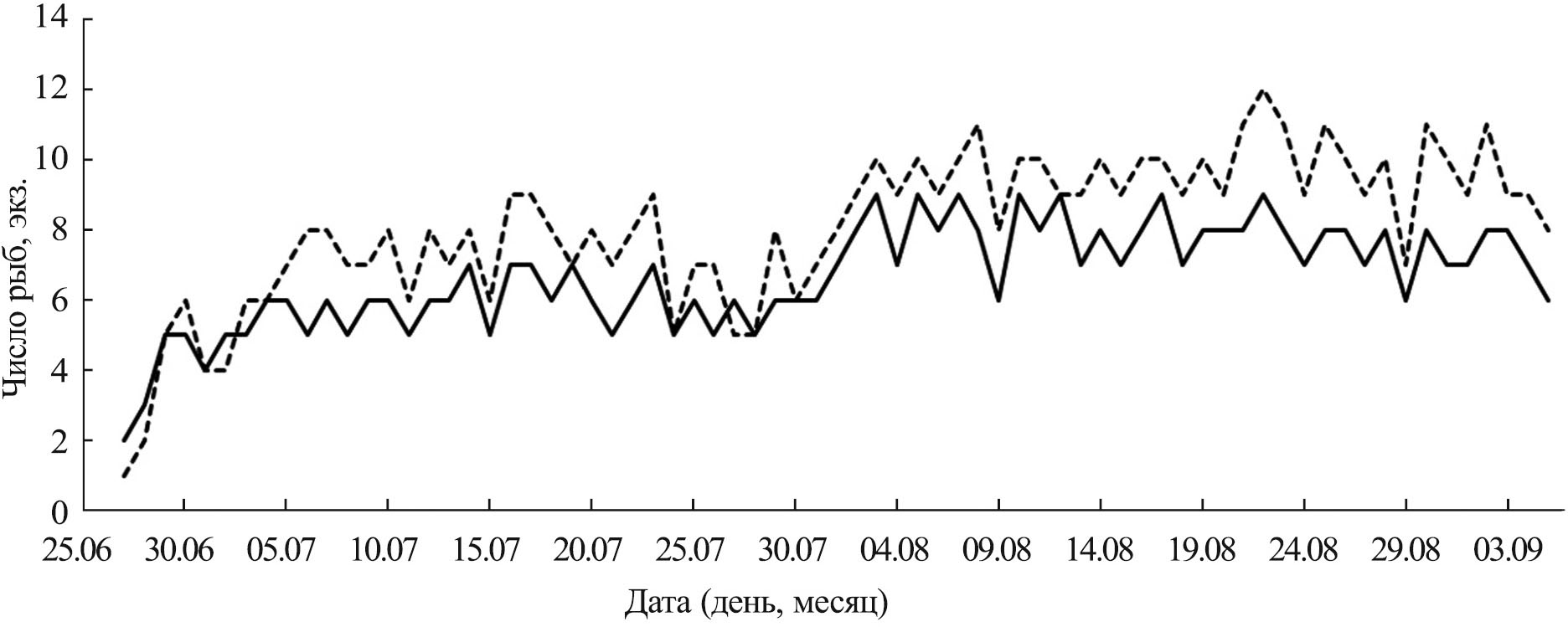 В течение периода наблюдений среднее число сазанов на полигоне поддерживалось на относительно стабильном уровне, даже несмотря на частичную элиминацию отловленных рыб и вероятное покидание места лова высвобожденными особями. По-видимому, привлечённые к полигону рыбы не покидают в поисках корма этот участок реки сразу же и задерживаются здесь на какое-то время, поскольку было замечено, что после внесения очередной дневной порции ядер-приманок сазан скапливался в зоне прикормки уже через 2–3 ч, т. е. значительно быстрее, чем в первые дни наблюдений. Ранее методами телеметрии было показано, что одичавший карп в небольшом замкнутом озере (40 га) обнаруживает место прикормки на 3–4 сут, запоминает его расположение и регулярно возвращается к нему из участков, предпочитаемых для дневного отдыха (Bajer et al., 2010). С применением радиометок показано, что карп может придерживаться определённых участков какое-то время, но для него возможны и протяжённые кочёвки и миграции – на расстояние до 120 км за месяц наблюдений (Koehn, Nikol, 2016). Такие же результаты получены ранее для половозрелого сазана дельты Волги (Неловкин, 1963).