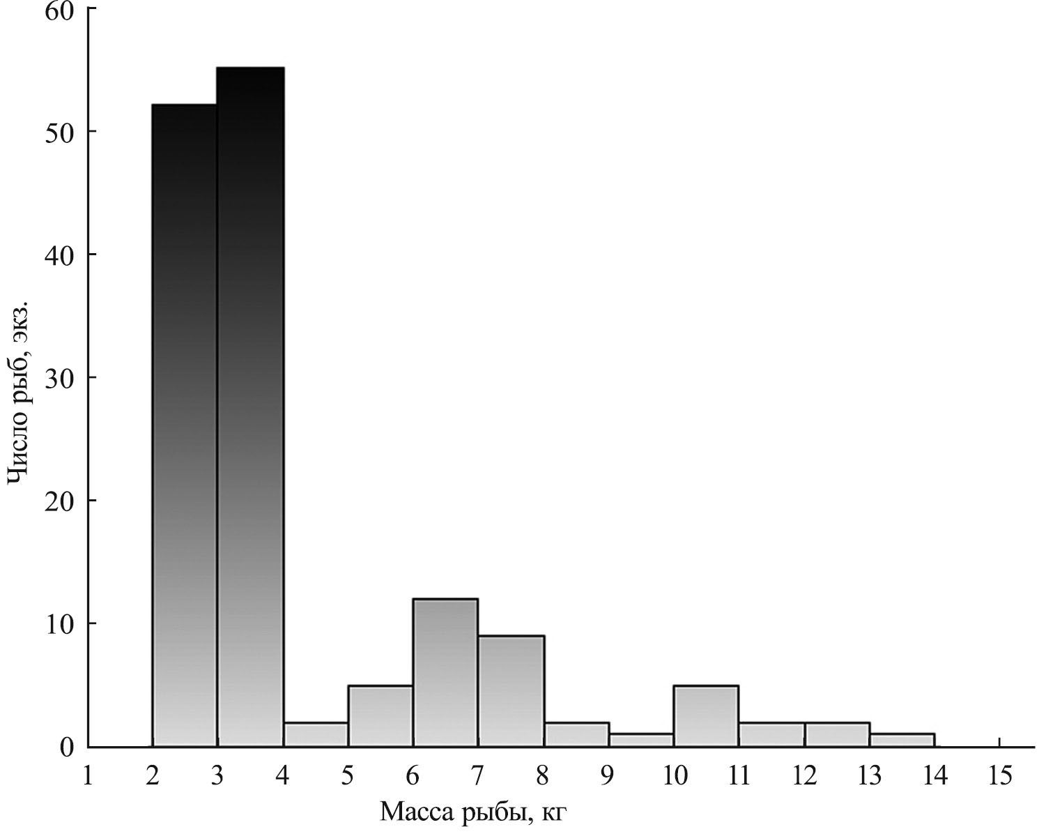 Масса тела выловленных сазанов варьировала от 2 до почти 14 кг, и по этому параметру их можно разделить на три условные группы (рис. 7). Наиболее многочисленными в уловах были рыбы массой 2.2–3.5 (в среднем 3.02) кг – 89% всех рыб. В этой группе из 27 исследованных особей 14 оказались неполовозрелыми самками, остальные были неполовозрелыми (n = 9) и половозрелыми (n = 4) самцами, последние имели массу тела > 3 кг. Существенно реже в уловах присутствовали рыбы массой 5–8 (в среднем 6.9) кг – обычно не более 2–3 экз/сут. Это были половозрелые самки и самцы (n = 11), принимавшие, по-видимому, участие в нересте весной текущего года. Рыбы третьей условной группы массой тела > 10 кг в уловах были редкими, их общее число – 13, частота поимок 1 экз/5.3 сут. Все рыбы этой группы были выпущены в реку. Разные по размеру рыбы присутствовали в уловах всеми типами донок.