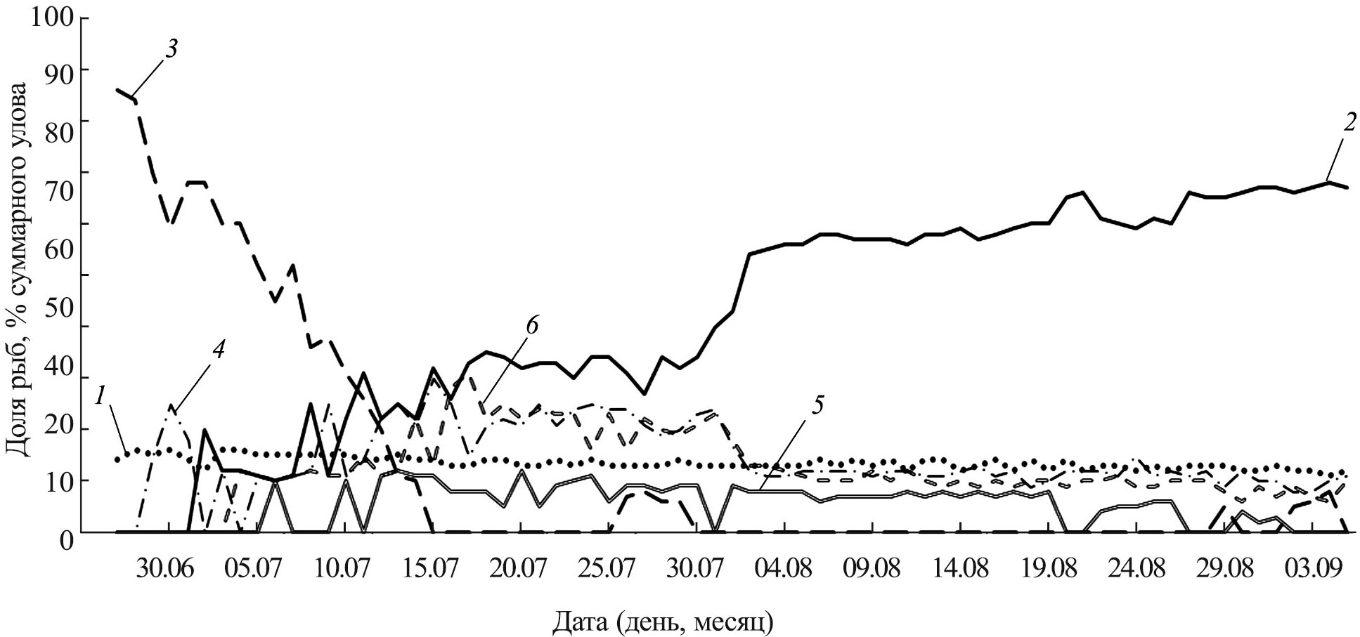 Рис. 8. Динамика уловов сазана Cyprinus carpio разными донками в 2018 г.: 1 – макушанка; донки с карповым монтажом с разными бойлами: 2 – “Сладкая кукуруза”, 3 – “Мидия”, 4 – “Тутти-фрутти”, 5 – “Клубника”, 6 – “Слива”.
