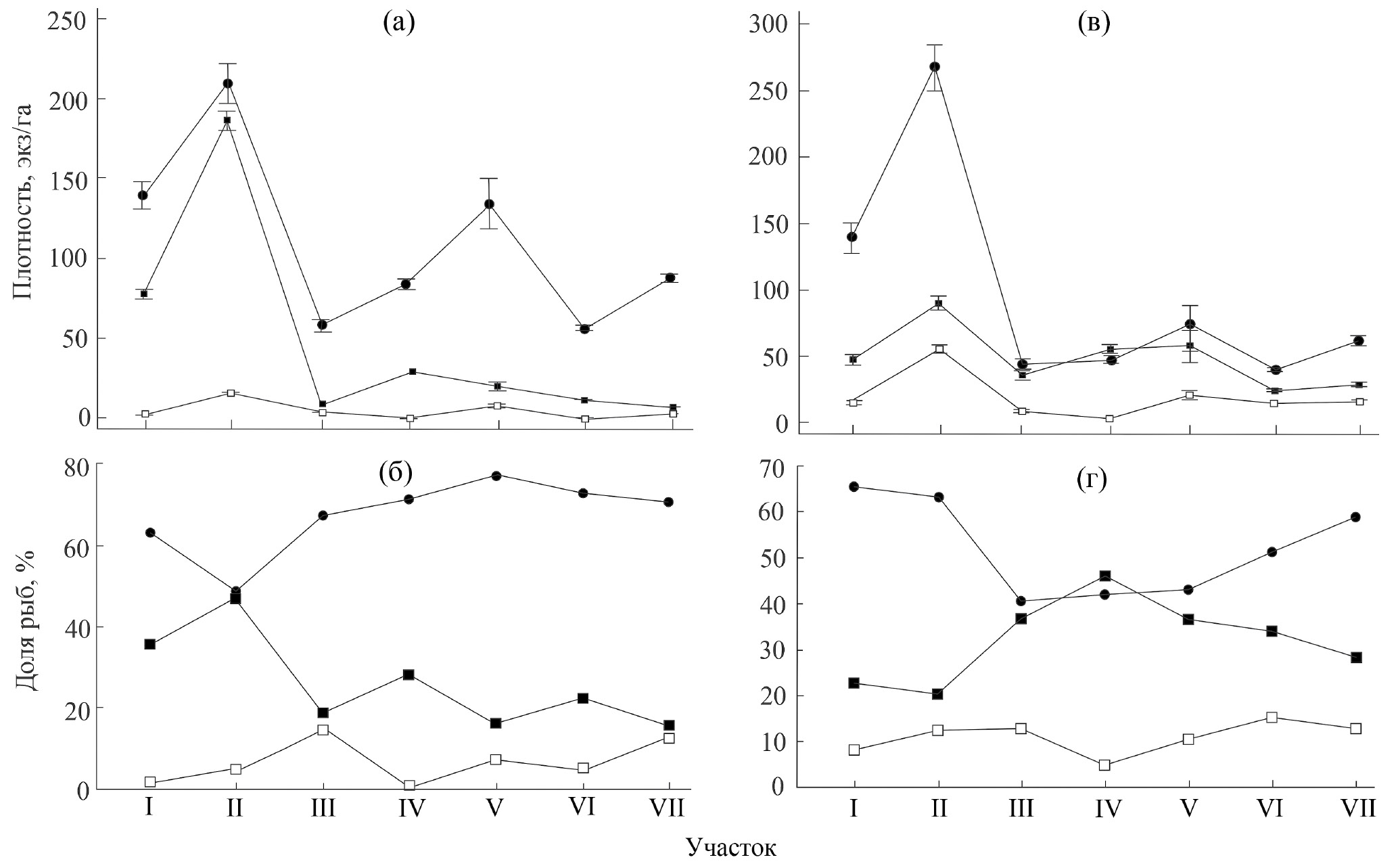 Наиболее многочисленны рыбы размерами 30–100 мм (рис. 6а). В приплотинном плёсе и Долоновском расширении их плотность составляет соответственно 134 ± 33 и 212 ± 63 экз/га. Высокая плотность рыб этой размерной группы и на участке V в Ангарском меридиональном сужении – 131 ± 51 экз/га, на остальных речных участках их плотность варьирует незначительно – от 54 ± 5 до 84 ± 13 (в среднем 69 ± 21) экз/га. Многочисленность представителей этой размерной группы обусловлена отсутствием в Братском водохранилище массовых крупных хищников, способных активно потреблять жертв таких размеров. Таймень в настоящее время в основном русле встречается редко, преимущественно на участке от плотины Иркутской ГЭС до г. Свирск, т.е. выше подпора Братского водохранилища. В последние десятилетия в Братском водохранилище отмечается и резкое снижение численности обыкновенной щуки Esox lucius Linnaeus, 1758. В 2000-е и 2010-е гг. во время легального промысла вылов щуки составлял <1 т/год, а в отдельные годы она вообще выпадала из данных промысловой статистики. Причинами этого являются неблагоприятный уровенный режим в водохранилище в период размножения вида, браконьерство и значительный вылов щуки рыболовами-любителями (Матвеев и др., 2012).