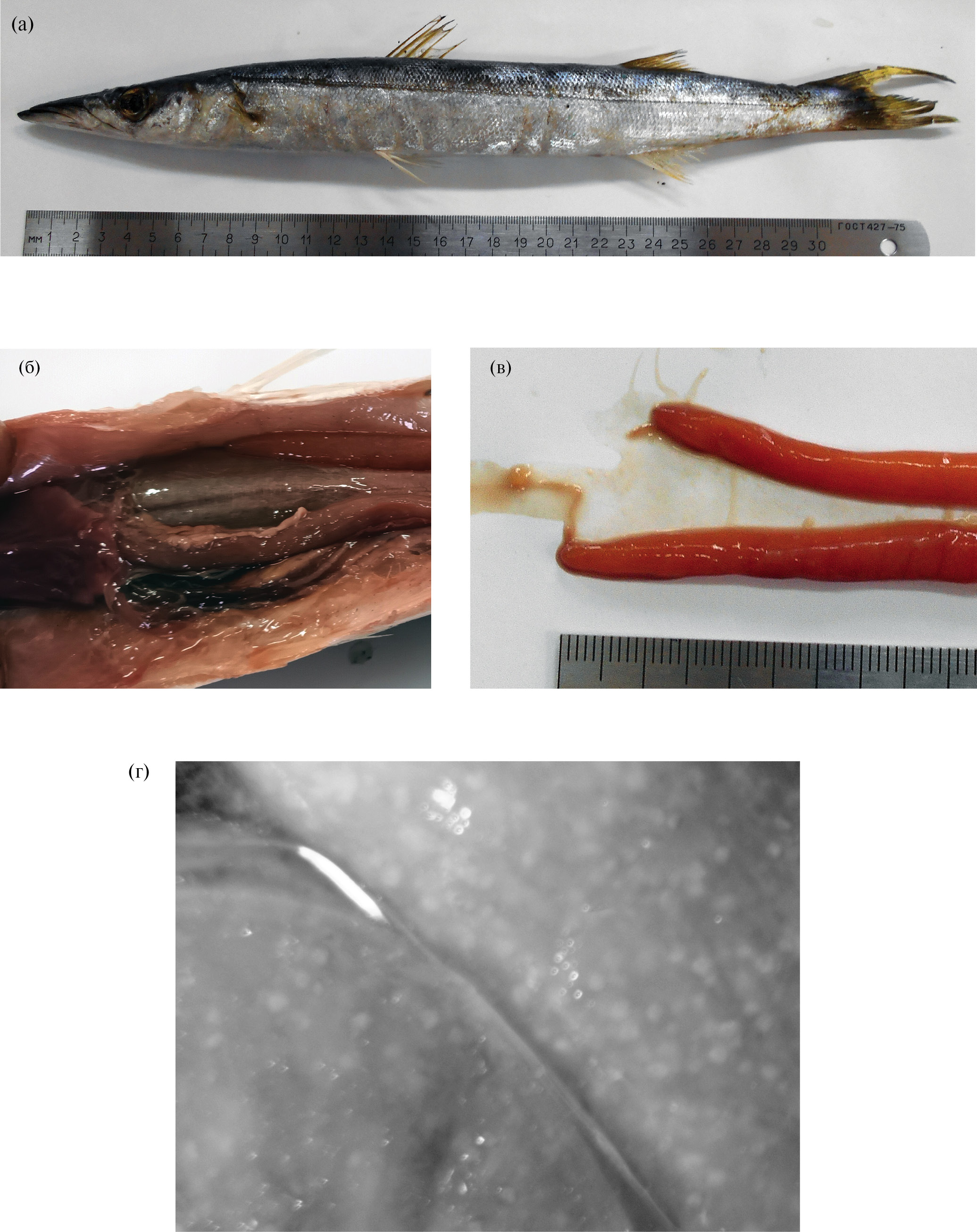 Морфологическое описание, зрелость, возраст и индивидуальный рост. Характерные видовые признаки пойманной особи соответствовали приведённым в определителях. При визуальном обследовании покровов и внутренних органов признаков патологии у добытого экземпляра барракуды не выявлено (рис. 2а, 2б). Основные характеристики особи: самка TL 35.4, FL 32.7, SL 31.8 cм; общая масса тела 196.4, без внутренностей – 162.2 г; масса гонад 1.999 (рис. 2в), печени – 2.744 г.