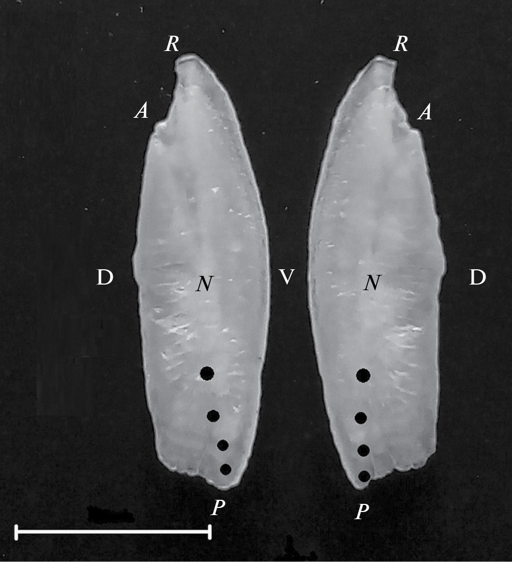 Рис. 3. Отолиты (сагитты) Sphyraena sphyraena TL 35.4 см, выловленной у берегов Крыма 28.10.2022 г.: D, V – дорсальная и вентральная стороны; R – рострум, A – антерострум, P – построструм, N – ядро (нуклеус), (l) – годовое кольцо. Масштаб: 5 мм.
