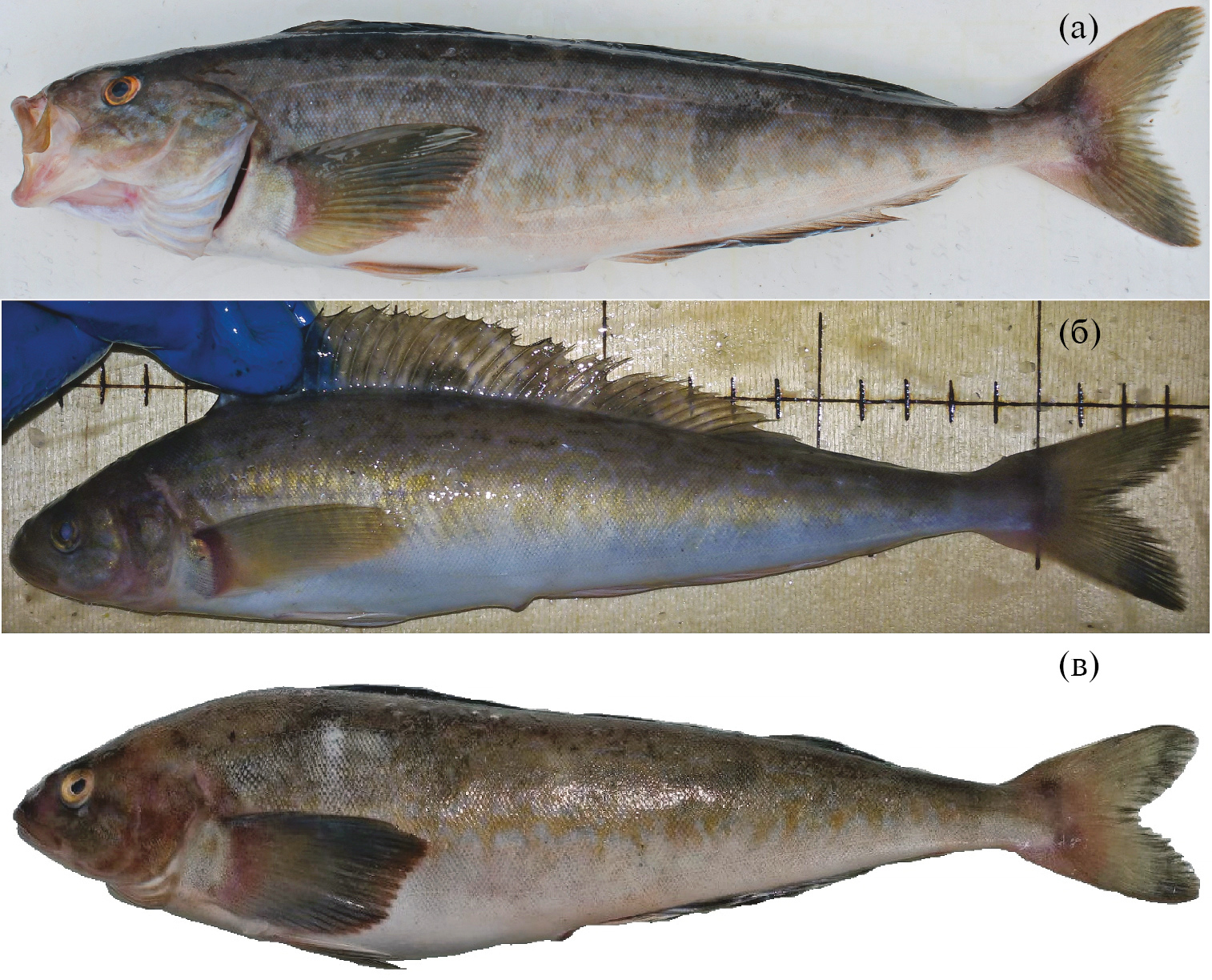 Рис. 1. Особи Pleurogrammus azonus из прикамчатских вод: а – TL 35.3 см, 2022 г., Кроноцкий залив; б, в – FL 24.0 и 35.4 см, 2018 и 2023 гг., западное прибрежье Камчатки.