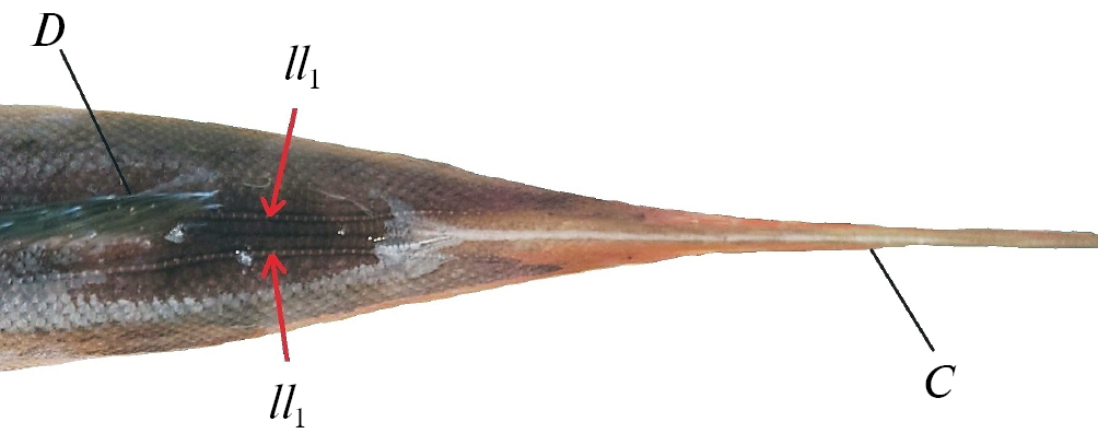 Рис. 2. Топография первой пары боковых линий (ll1) на хвостовом стебле Pleurogrammus azonus из Кроноцкого залива: C, D — хвостовой и спинной плавники.