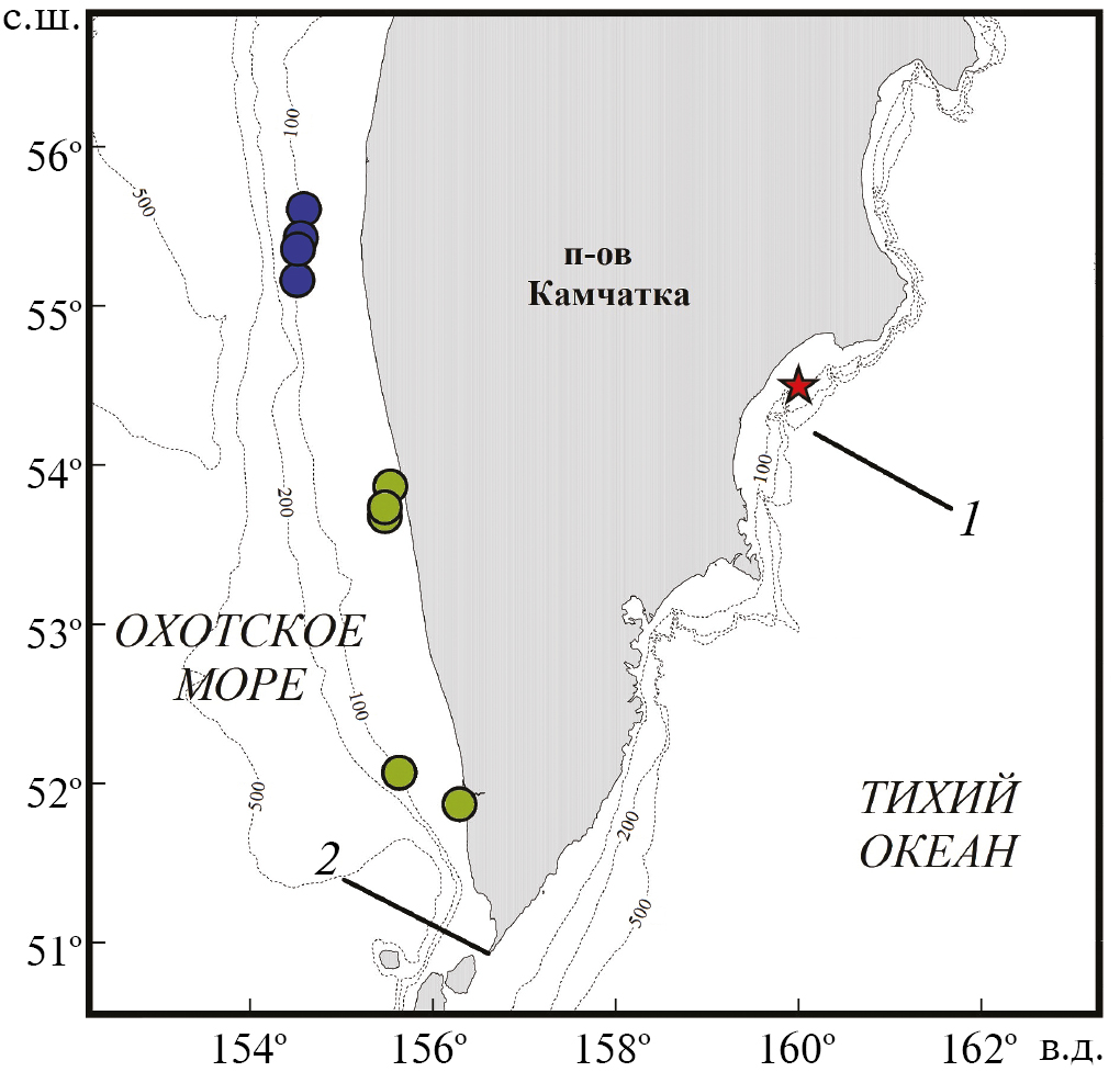 Рис. 3. Места поимок Pleurogrammus azonus у побережья Камчатки: (★) – июль 2022 г., (●) — май–июнь 2023 г., (●) – январь–февраль 2024 г.; 1 – Кроноцкий залив, 2 – м. Лопатка; (---) – изобаты.