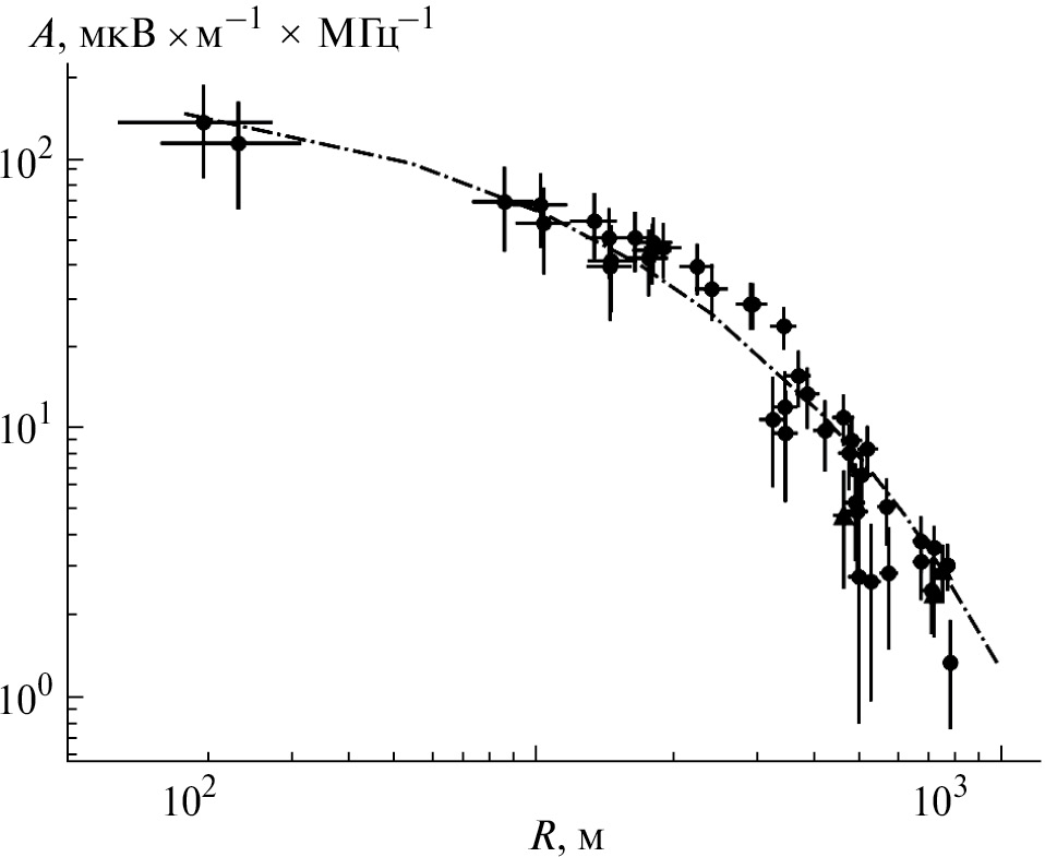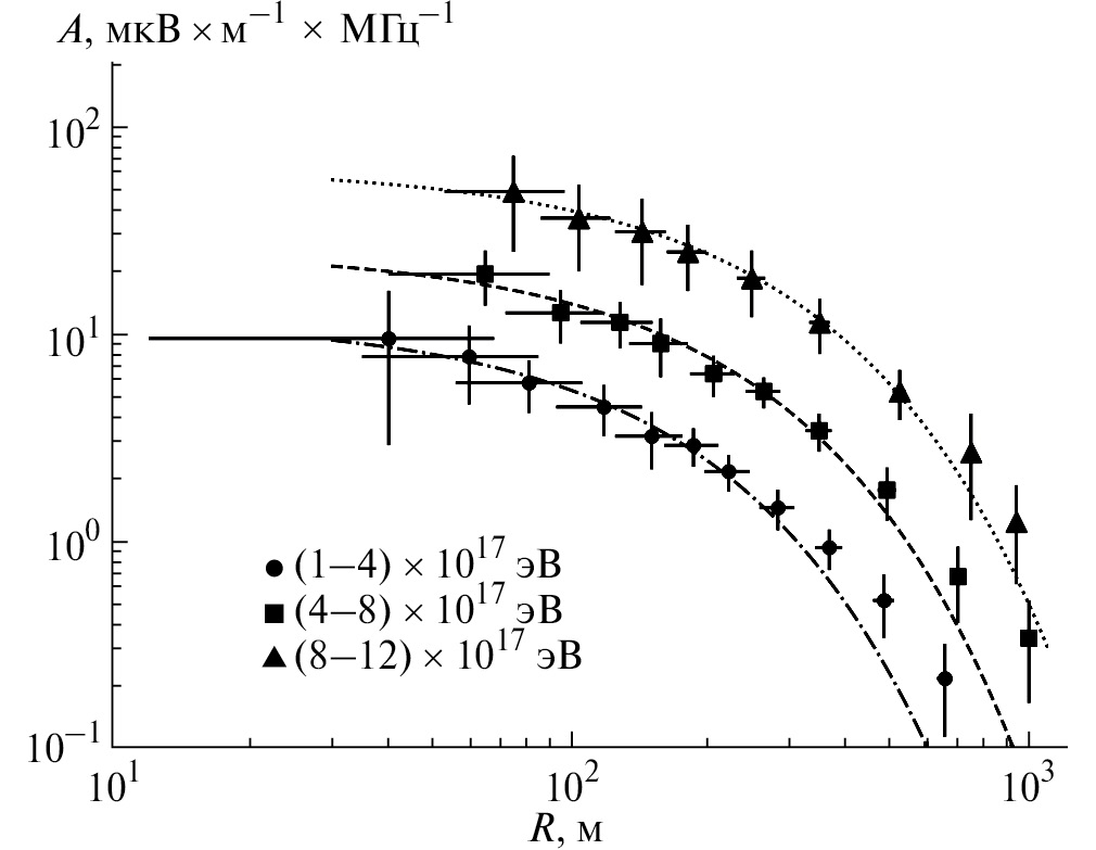 На рис. 3 показано пространственное распределение радиосигналов, зарегистрированное в ливнях с энергиями выше 1019 эВ (табл. 1). Большая часть ливней имеет энергии 1019 – 3.5 × 1019 эВ и два ливня с энергией выше 1020 эВ [15]. Точки нормированы на среднюю энергию <E0> = 1.5 × 1019 эВ и приведены к среднему зенитному углу <θ> = 43°. Данные представлены в логарифмическом масштабе. Кривой показана аппроксимация точек согласно формуле (1). Сигналы ливней с энергией 1020 эВ обозначены треугольниками. Горизонтальной линией показаны ошибки лоцирования оси ливня, а вертикальными — ошибки измерения сигнала радиоизлучения ШАЛ.