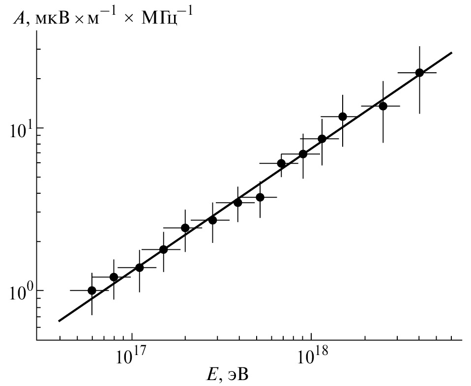 Для нахождения корреляции амплитуды радиосигнала от энергии ШАЛ были использованы ливни, совместно зарегистрированные детекторами черенковского света и антеннами радиоизлучения. Энергия определялась по потоку черенковского света ШАЛ на расстоянии 400 м от оси ливня [16]. Амплитуда радиоизлучения бралась на расстоянии 350 м по направлению Восток—Запад. Большинство отобранных для анализа ШАЛ зарегистрировано в сезонах 2009–2012 гг. Ливни с максимальной энергией выше 1019 эВ взяты из наблюдений в сезонах 1987–1989 и 2009–2018 гг. На рис. 4 показана корреляция энергии ШАЛ Е0 и амплитуды радиосигнала Amax. Здесь энергия определялась по полному потоку черенковского света ШАЛ. Аппроксимация экспериментальных данных степенной функцией дает следующую эмпирическую формулу связи амплитуды радиосигнала с энергией ливня со значением χ2 = 0.13: