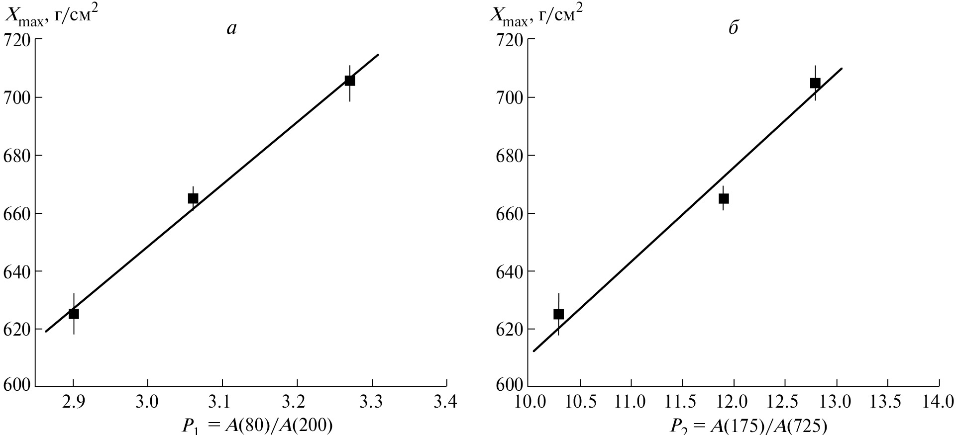 Далее формулы (4) и (5) использовались для определения Xmax в индивидуальных событиях ШАЛ. Точность, с которой определялась глубина максимума Xmax, находилась в пределах 20–35 г/см2 для высот максимума ливня 600–790 г/см2. С приближением Xmax к уровню моря точность определения Xmax ухудшается. Средние значения Xmax, определенные в разных интервалах по энергии, даны на рис. 6, а.