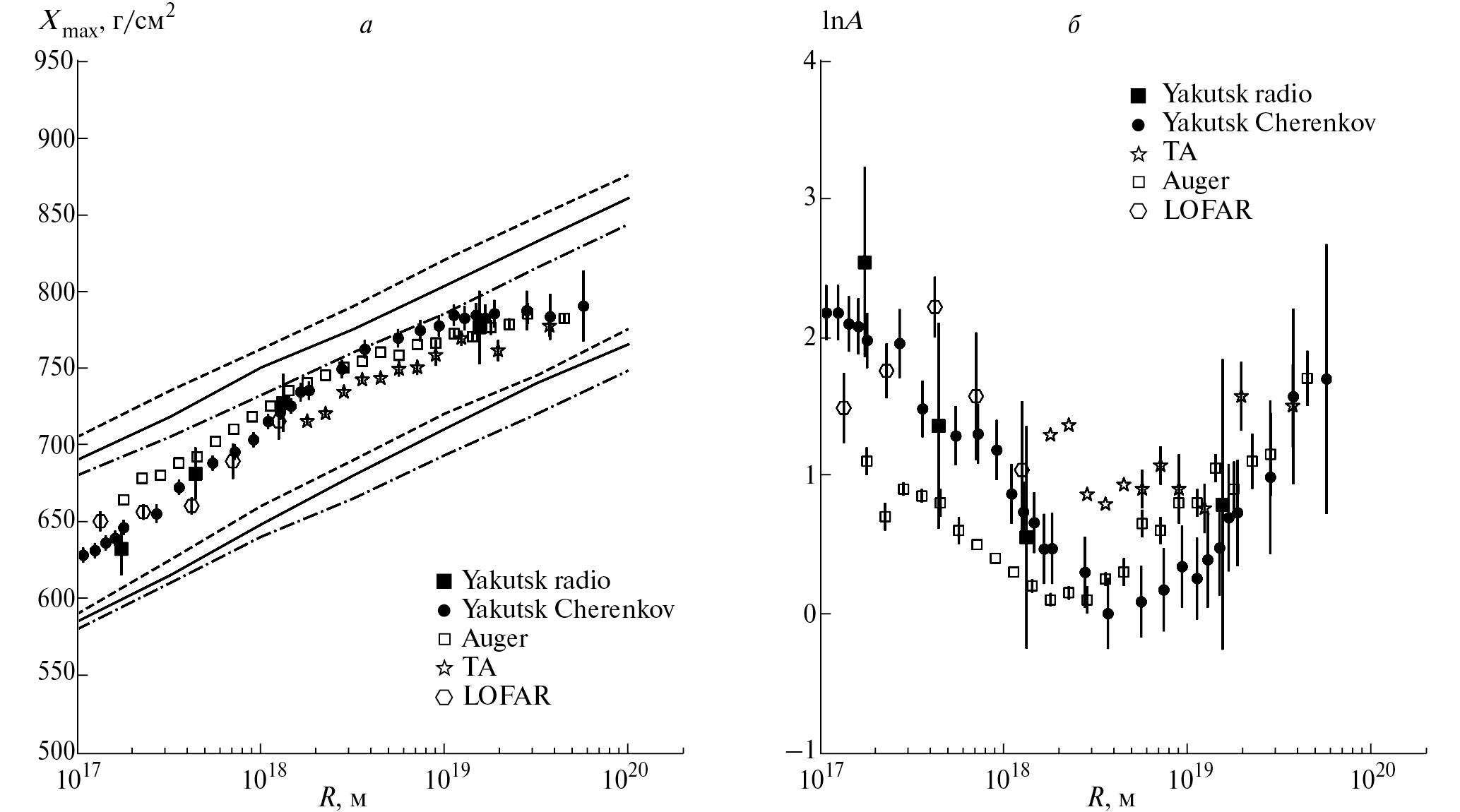 Значения <lnA> для разных энергий показаны на рис. 6, б в сравнении с данными черенковских детекторов Якутской установки [26], ТА [27] и Оже [28]. Как видно, данные по радиоизлучению согласуются с другими экспериментами.