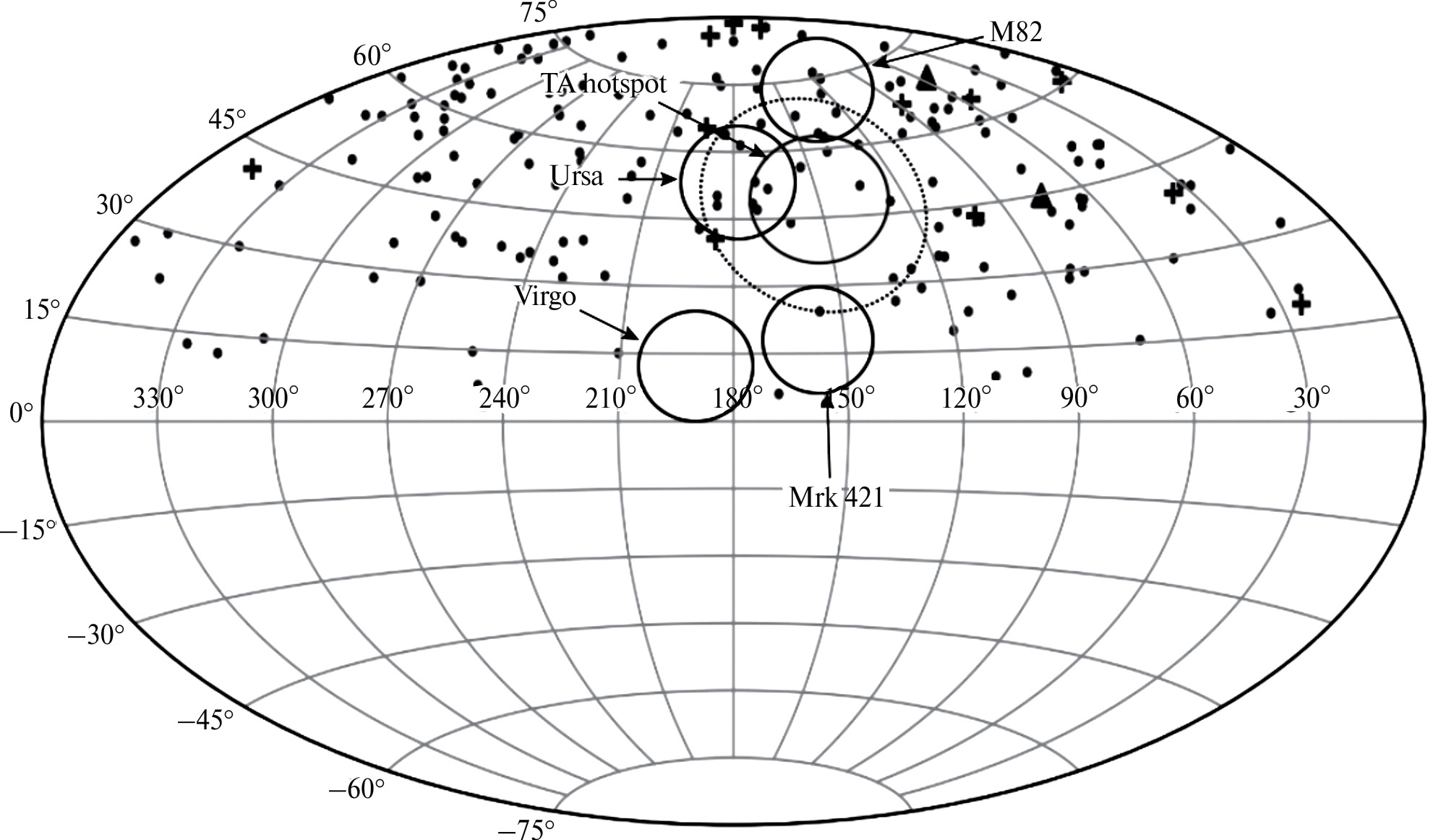 Дополнительно точками показаны ливни из работы [29], это ливни, зарегистрированные на Якутской установке с энергиями выше 5 × 1018 эВ, с близкими характеристиками и пришедшие друг за другом в течение 24 ч.