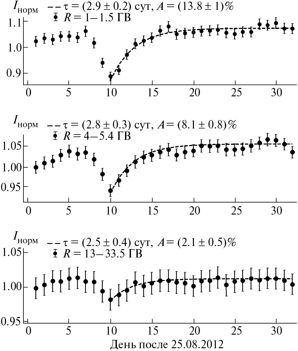 Рис. 3. Iнорм — нормированные интенсивности КЛ во время ФП, зарегистрированного спектрометром АМS-02 в сентябре 2012 г. для трех интервалов жестокостей; А — амплитуда ФП (%); τ — время восстановления (сут).