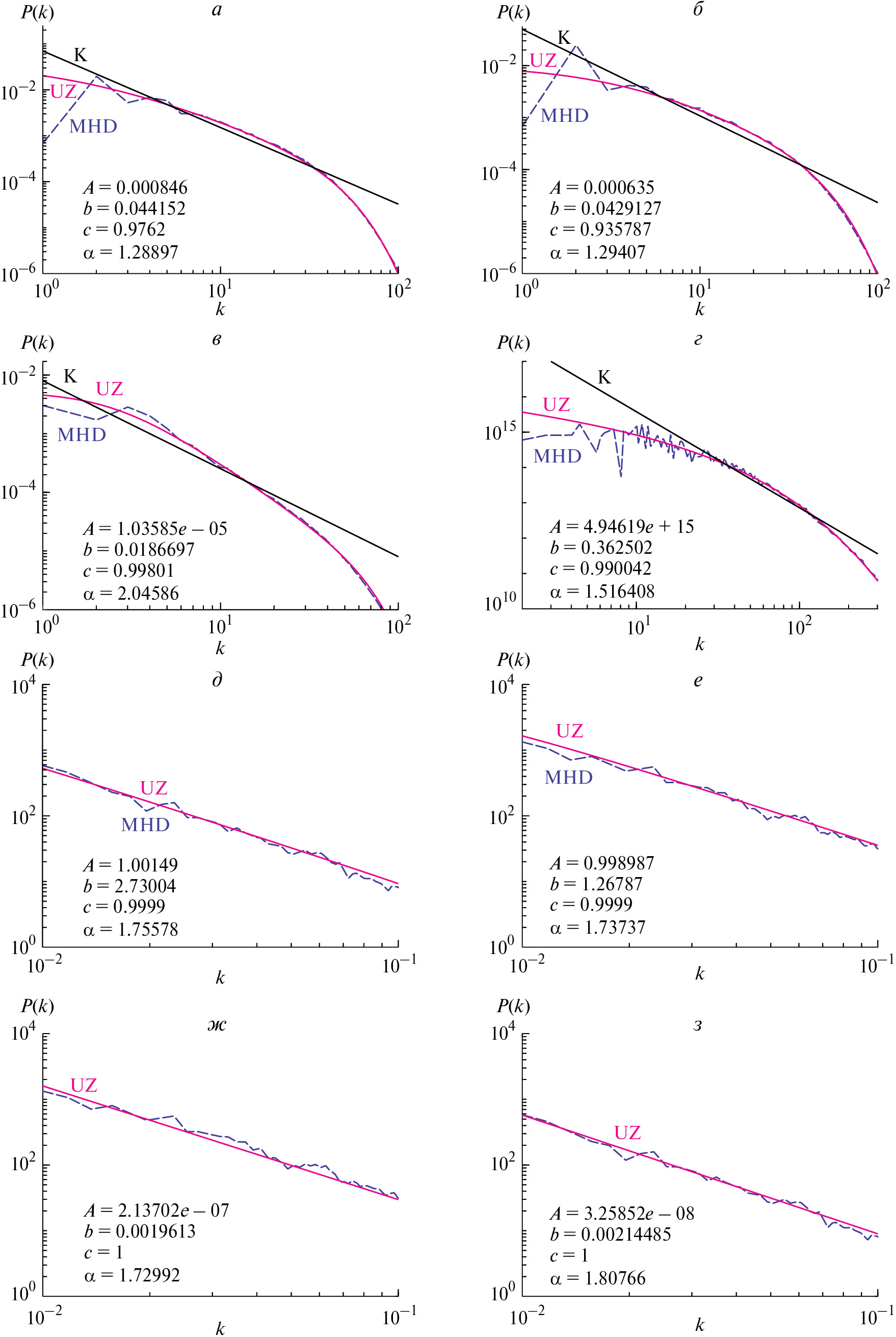 Рис. 1. (а–з) УЗ-аппроксимации спектров мощности турбулентных флуктуаций скорости в четырех различных режимах, численно моделированных в [25–27]. Штриховые кривые представляют результаты моделирования, сплошные — их аппроксимации формулой (4). Наклонные прямые соответствуют чисто степенным спектрам.