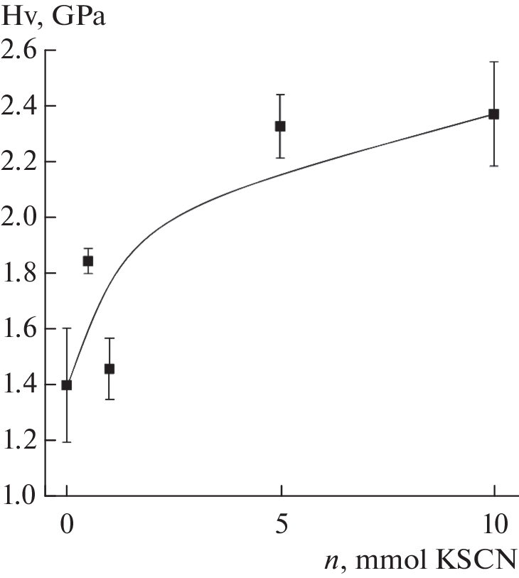 The electrochemical and corrosion behavior of Fe80.22Si8.25Nb10.09Cu1.44 amorphous metal alloy (AMA) was studied in alkali water solutions with the addition of potassium thiocyanate. An increase in the rate of electrode processes (stimulation) in comparison with the base solution was observed at a KSCN concentration of 0.5, 1.0, and 10.0 mM. At a concentration of 5.0 mM, there was a reduction in both cathodic and anodic processes (inhibition). These findings were interpreted within the framework of an electrochemical mechanism and specific structural features of the electrode material. A change in mechanical properties of AMA after exposure of the alkaline medium with a composition of 0.5 М KON + y mM KSCN, where y = 0.5, 1.0, 5.0, and 10.0, was studied. A change in surface roughness has been established. The fracture pattern changed from a brittle cleavage without influence of the environment to the plastic destruction with crack branching and formation of folded structures for all used solutions. After exposure of the 0.5 М KON + 5 mM KSCN solution, a twofold decrease in tensile strength and Young’s modulus was observed. An increase in the KSCN concentration leads to an increase in surface microhardness.
