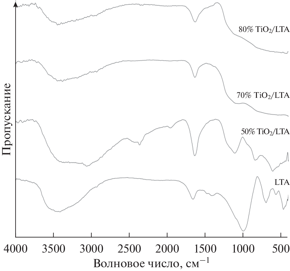 For the first time, using solution technology in a reactor under pressure, composites of titanium oxide and LTA zeolite containing 50, 70, and 80% TiO2 were obtained. The materials were characterized by XRD, IR spectroscopy, SEM, energy-dispersive microanalysis, and low-temperature nitrogen adsorption–desorption. The adsorption and photocatalytic properties of the composites were studied using the model dye Rhodamine B as an example. The surface morphology and the textural, adsorption, and photocatalytic properties of the resulting composites, as well as the phase composition of TiO2, largely depend on the degree of coverage of the surface of the zeolite. For 80% TiO2/LTA composites, a degree of coverage close to 100% was observed, and it is for this composition, with a size of TiO2 crystallites of about 11 nm and an anatase/rutile phase ratio of about 0.54, that the highest photocatalytic activity was found.
