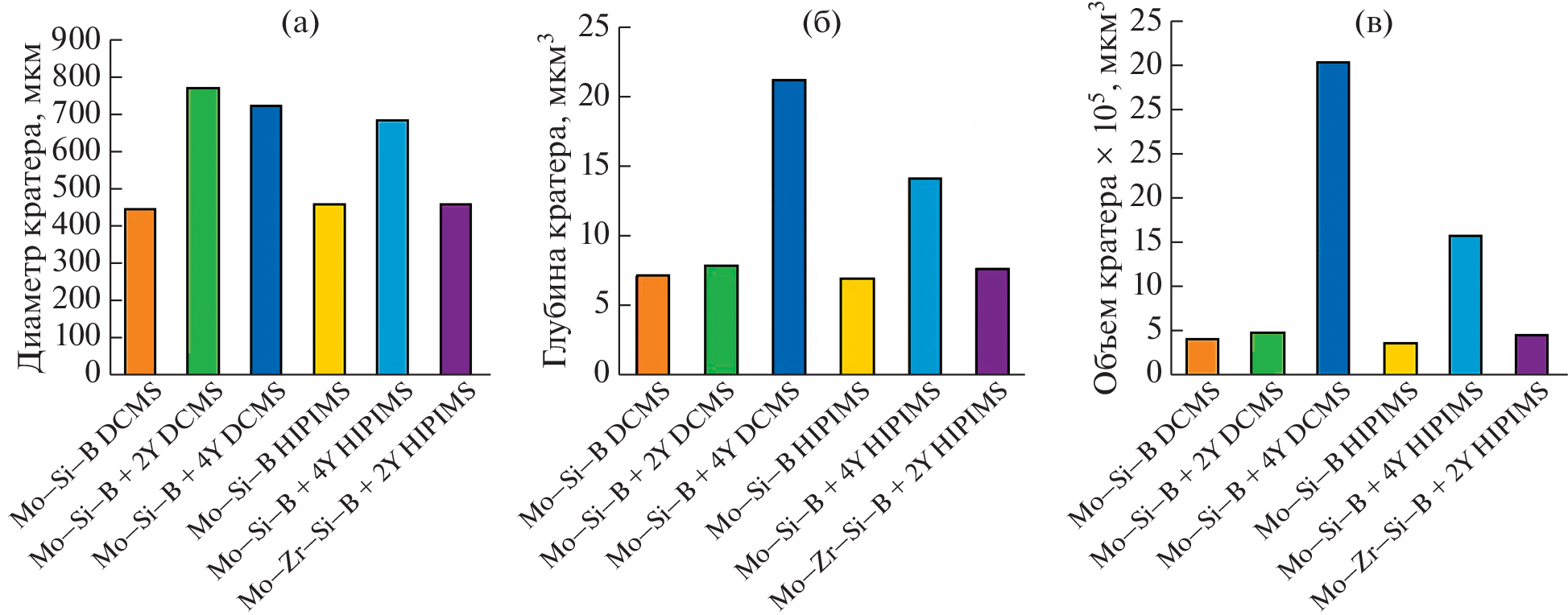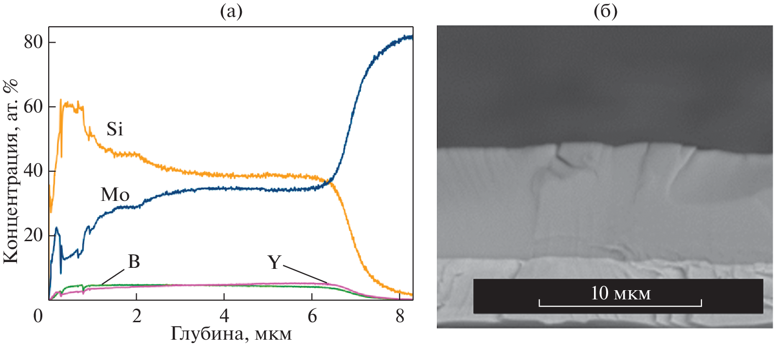 Mo–(Y, Zr)–Si–B coatings were obtained by direct current magnetron sputtering (DCMS) and high-power impulse magnetron sputtering (HIPIMS) using composite targets of MoSi2 + 10% MoB and (MoSi2 + 10% MoB) + 20% ZrB2, with the Y segments located in their erosion zone with a total area of 5 and 10 cm2. The structure and composition of the coatings were studied by scanning and transmission electron microscopy, glow discharge optical emission spectroscopy, and XRD. The hardness, elastic modulus, elastic recovery, adhesive strength, and resistance of the coatings to abrasive wear and cyclic impact loading were determined. The oxidation resistance and thermal stability were estimated by heating the coatings to a maximum temperature of 1000°C in a muffle furnace and in a transmission electron microscope column, respectively. It has been established that the Mo–Si–B coating contains the h-MoSi2 phase with preferred orientation in the [110] direction and crystallite size of 75 nm. Alloying of Zr and Y coatings, as well as the transition from DCMS to HIPIMS mode, contributed to the suppression of preferential growth of crystallites, increasing their dispersity and the volume fraction of the amorphous phase, which led to an increase in the crack resistance and adhesive strength of the coatings. The HIPIMS method in coating deposition caused an increase in the hardness and elastic modulus by 10%; resistance to cyclical impact, by 60%; and abrasive resistance, by 20%; it also increased oxidation resistance up to 20%. Mo–Y–Zr–Si–B coatings with the optimal composition demonstrated high thermal stability; the main structural component is the hexagonal phase h-MoSi2; it remained in the temperature range of 20–1000°C and also resulted in a more than ninefold increased oxidation resistance of the Mo substrate at 1000°C.