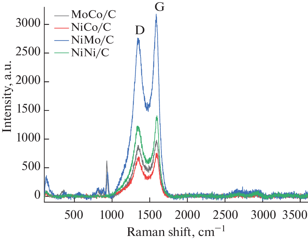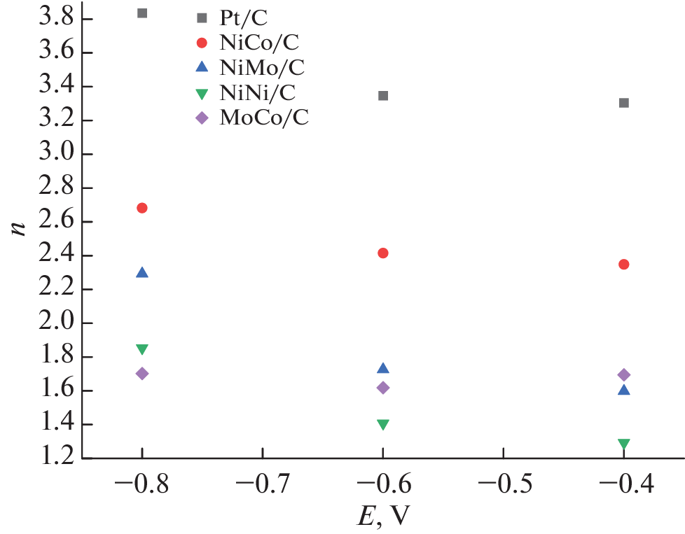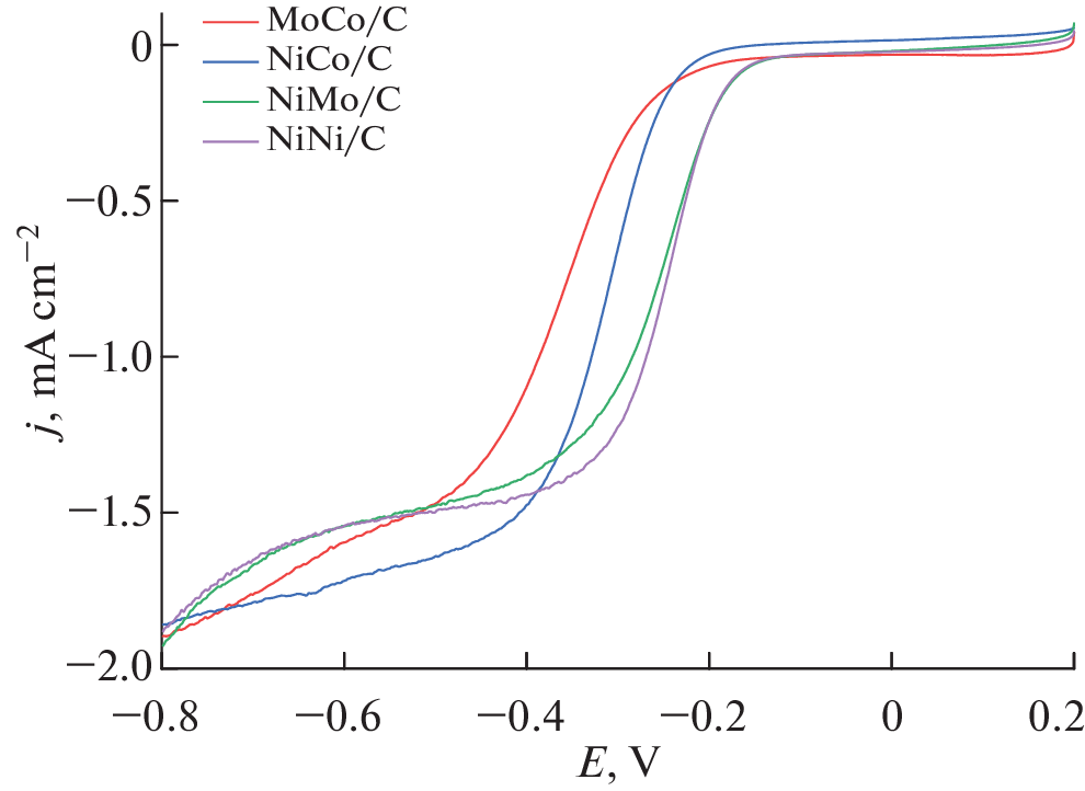 This paper presents the results of a study of the catalytic activity of bimetallic materials synthesized based on Vulcan XC-72 carbon black modified with nickel, cobalt, and molybdenum in the electrochemical oxygen reduction reaction. The studies of the synthesized catalysts by adsorption–desorption of nitrogen in vacuum show that they are mesoporous and possess low porosity and surface area. After modification with metals, the surface area of the catalyst and pore volume decrease. The Raman spectra of the samples evidence probable formation of intermetallics or mixed molybdenum oxides on the surface of the MoCo/C and NiMo/C catalysts, which is in agreement with the published data. Scanning electron microscopy shows the formation of spherical metal parties on amorphous Vulcan XC-72. All the studied bimetallic catalysts possess similar kinetic characteristics of the electrochemical oxygen reduction reaction; nevertheless, NiMo/C and NiNi/C catalysts manifest a higher activity. The verification of the robustness of operation of the synthesized catalysts shows their high corrosion resistance.