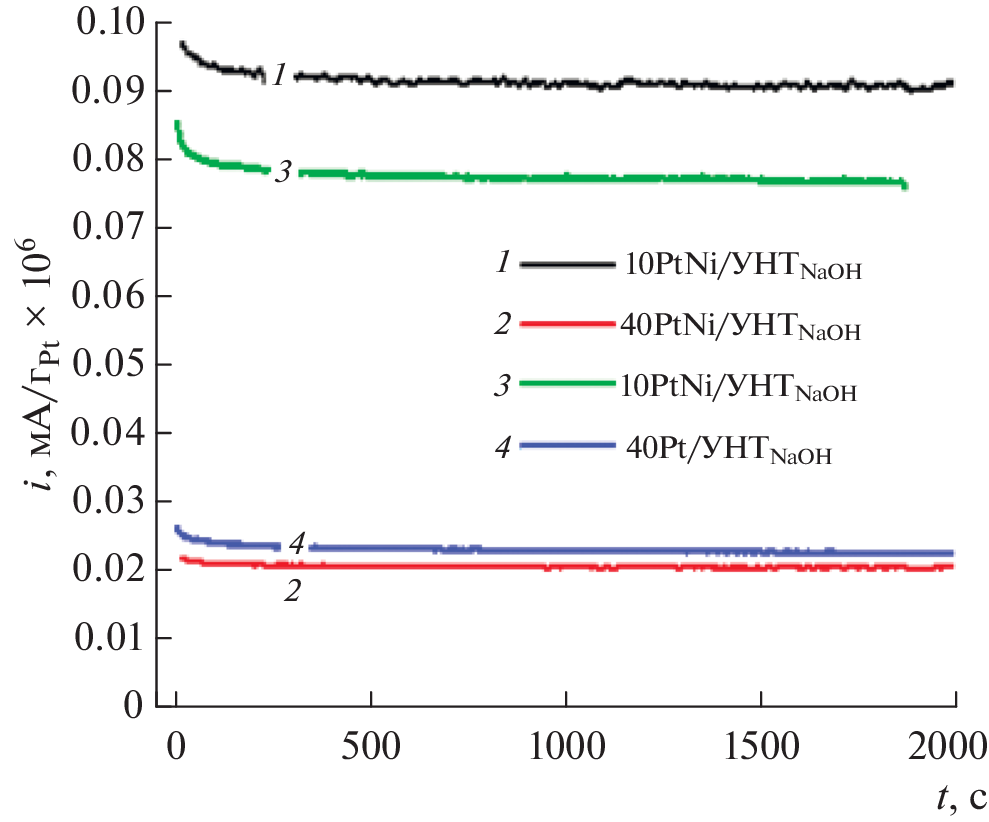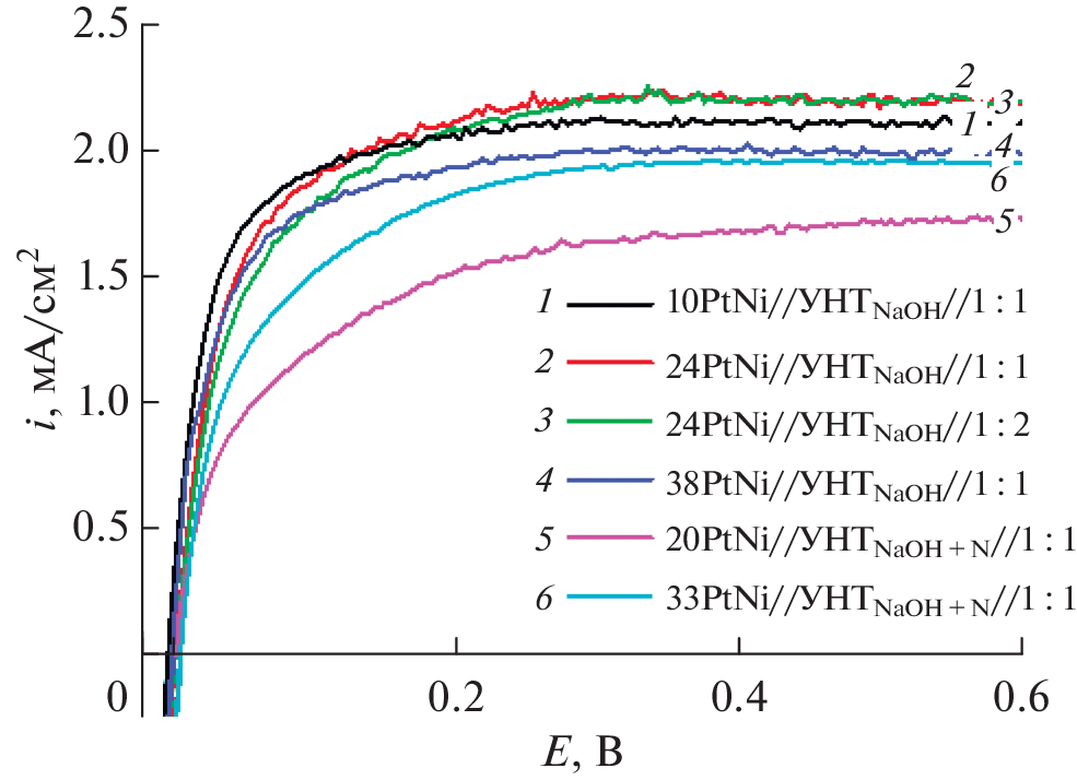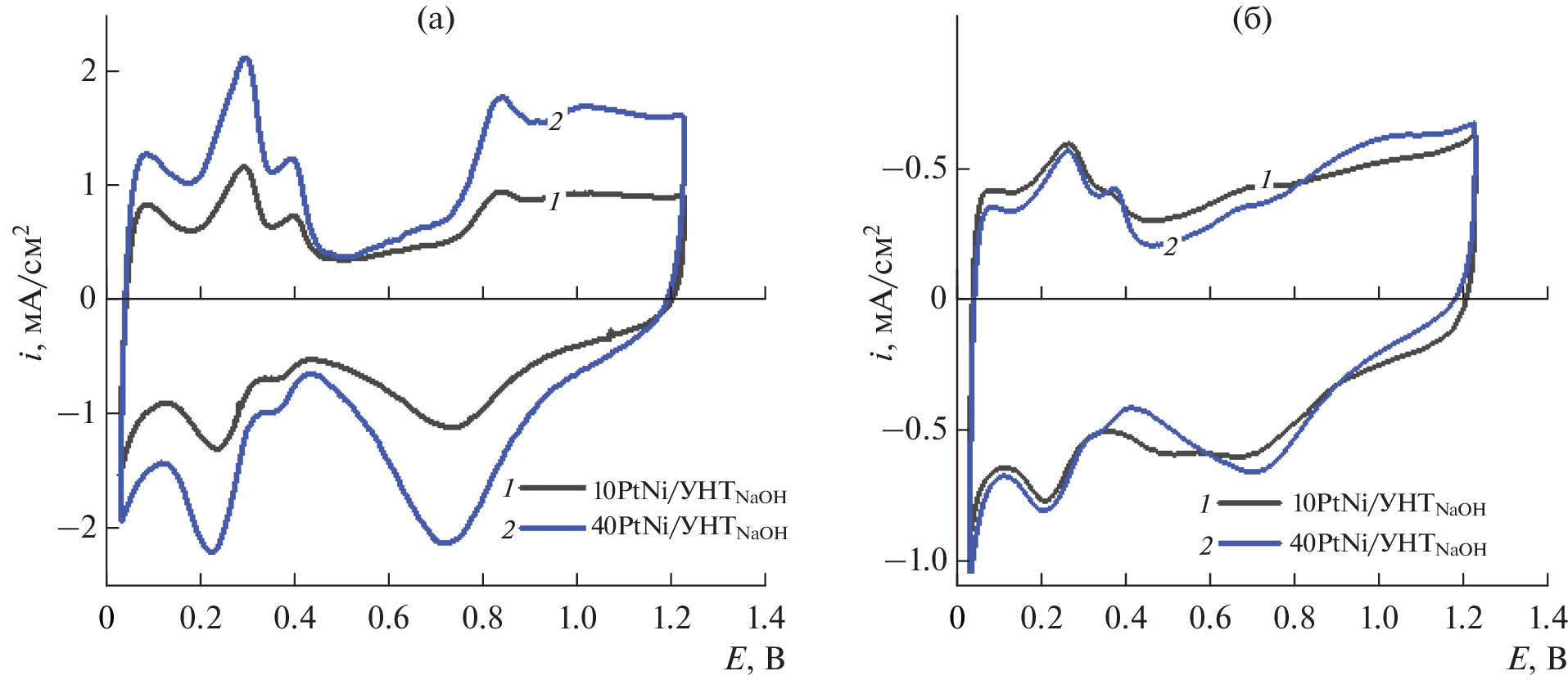 PtNi catalysts on carbon nanotubes (CNTs) subjected to preliminary treatment are synthesized and studied in the hydrogen oxidation reaction (HOR) in an alkaline electrolyte. A comparison of the structural and morphological and electrochemical characteristics of monoplatinum (Pt/CNTs) and bimetallic (PtNi/CNTs) catalysts in the HOR at equal concentrations of platinum and the same CNTs is conducted. It is found that catalysts synthesized on nanotubes functionalized in an alkali (CNTsNaOH) are significantly superior to PtNi catalysts synthesized on CNTs doped with nitrogen and monoplatinum catalyst in terms of stability and activity in the HOR. A PtNi/CNTsNaOH catalyst with a weight concentration of platinum of 10% manifests the highest activity in the HOR at a Pt : Ni ratio of 1 : 1. The main parameters providing high characteristics of the bimetallic system are the presence of active sites for the fixation of the metal phase on the CNTsNaOH, concentration of platinum on the surface of the catalyst, and ratio of the metals.