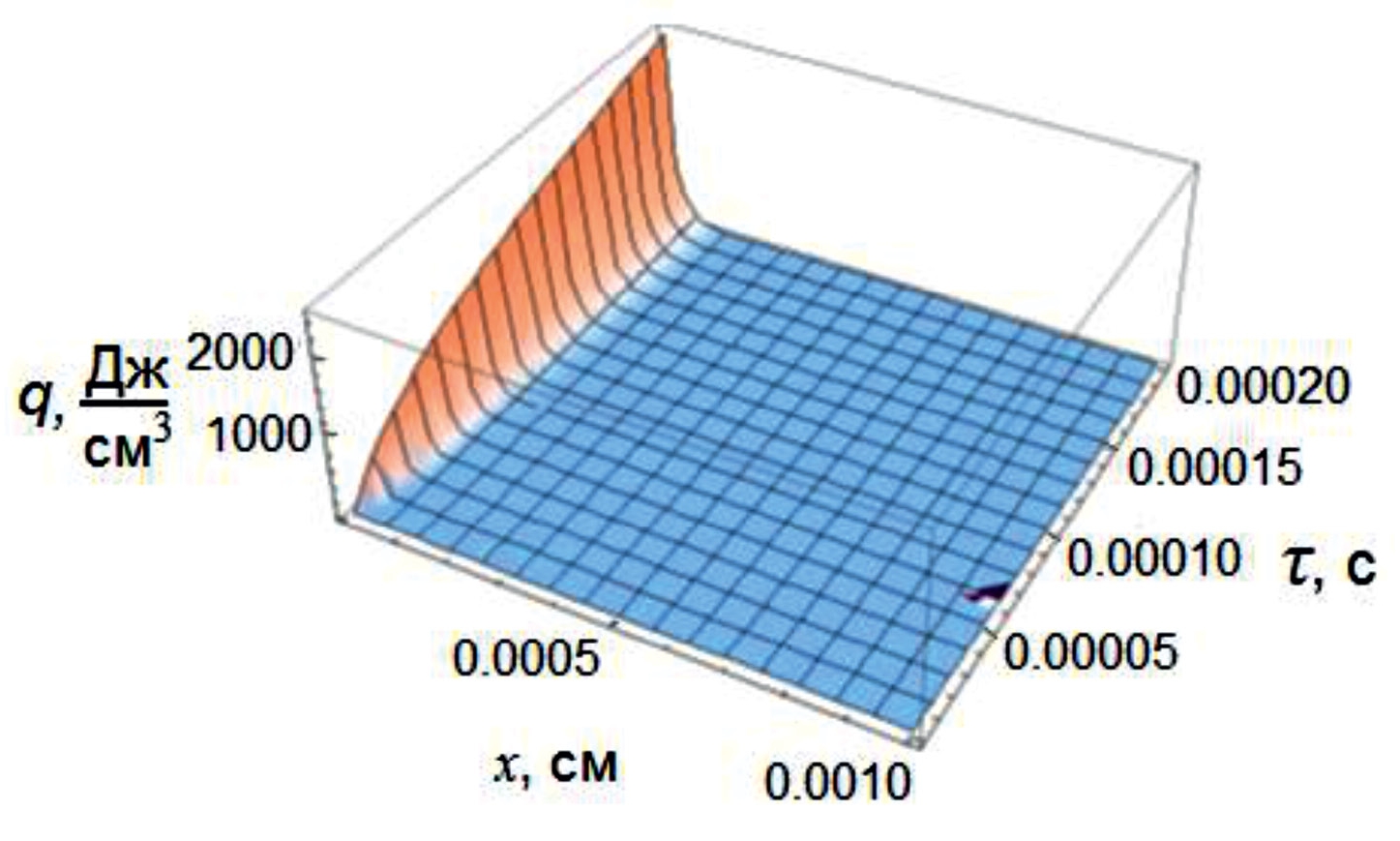 Из формулы (6) следует, что распределение плотности энергии в пограничном слое зависит от длительности импульса и напряжения. На рис. 1 приведено распределение плотности энергии в пограничном слое в зависимости от расстояния до поверхности электрода (x) и от длительности импульса (τ).