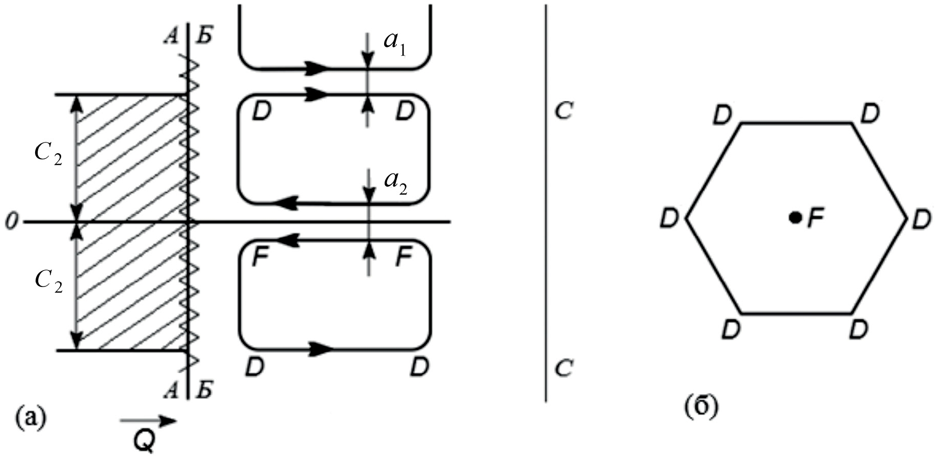 Рис. 2. Схема строения границы раздела фаз с образованием шестигранника: 0, А – места набегания потока электролита, А–А – часть изменяющейся поверхности электрода, Б–Б – плоскость, на которой выделяется или локализуется тепловая энергия (реализуются химические или электрохимические реакции), С–С – граница пограничного слоя Прандтля, D–D – направление восходящего потока, F–F – направление нисходящего потока, a₁ – ширина восходящего потока, a₂ – ширина нисходящего потока, Q – теплота, С₂ – радиус фрагмента: (а) вид сбоку, (б) вид сверху.