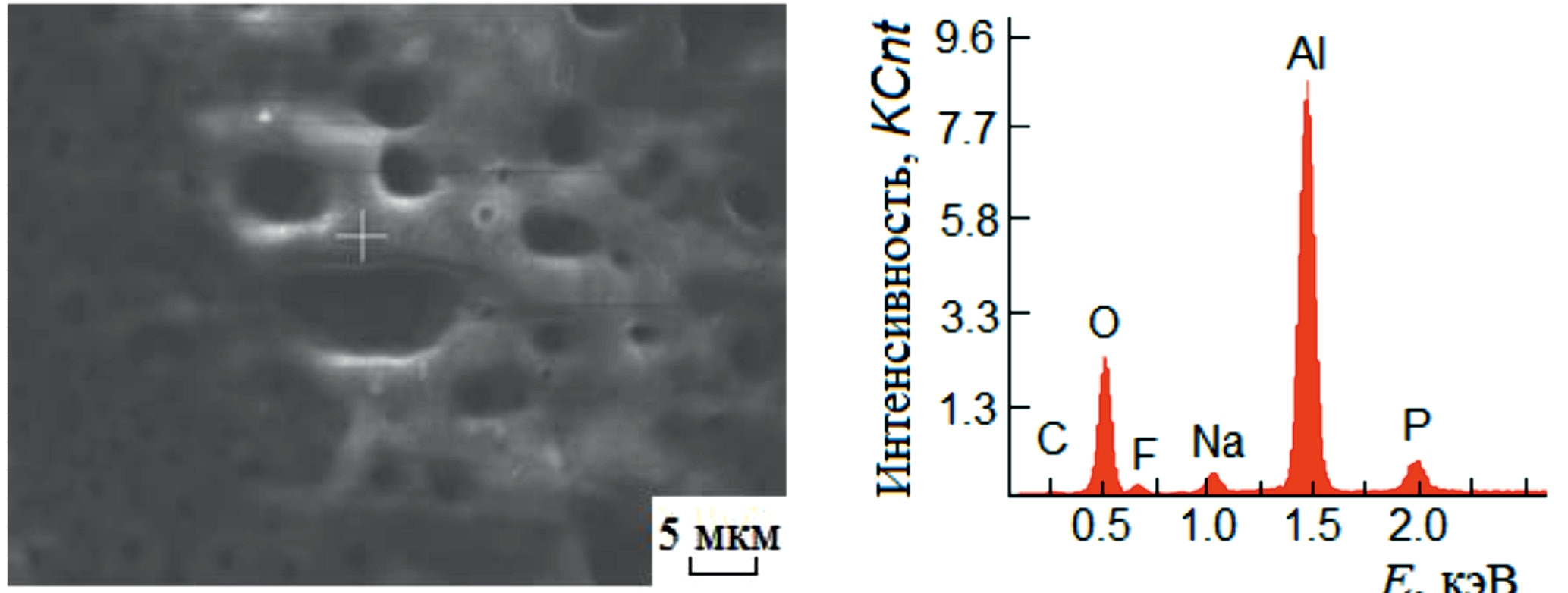 Состав покрытия в центре фрагмента (рис. 5) отличается от состава покрытия на его границе (рис. 6). В центре фрагмента определено повышенное количество алюминия (рис. 5); это говорит о том, что в этом месте толщина покрытия небольшая и происходит образование поры.