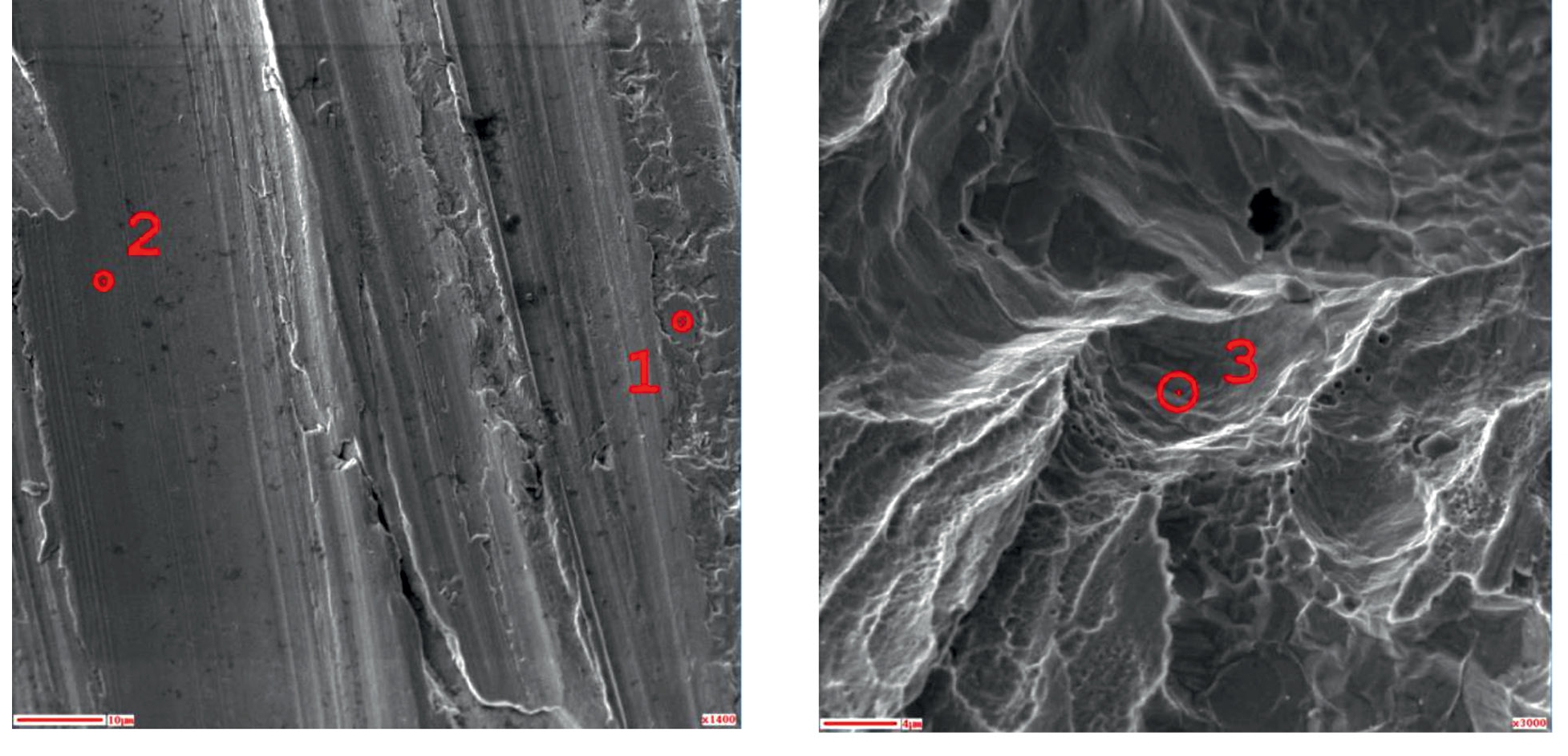 Рис. 3. Зоны проведения анализа на поверхности. Зона анализа № 1, неповрежденная поверхность образца — ∅ ≈ 2 мкм (расфокусированный пучок). Зона анализа № 2, поверхность образца после абразивной обработки - ∅ ≈ 2 мкм (расфокусированный пучок). Зона анализа № 3, поверхность внутри раковины “питтинговой” коррозии — точечно, ∅ ≈ 2 мкм (расфокусированный пучок).