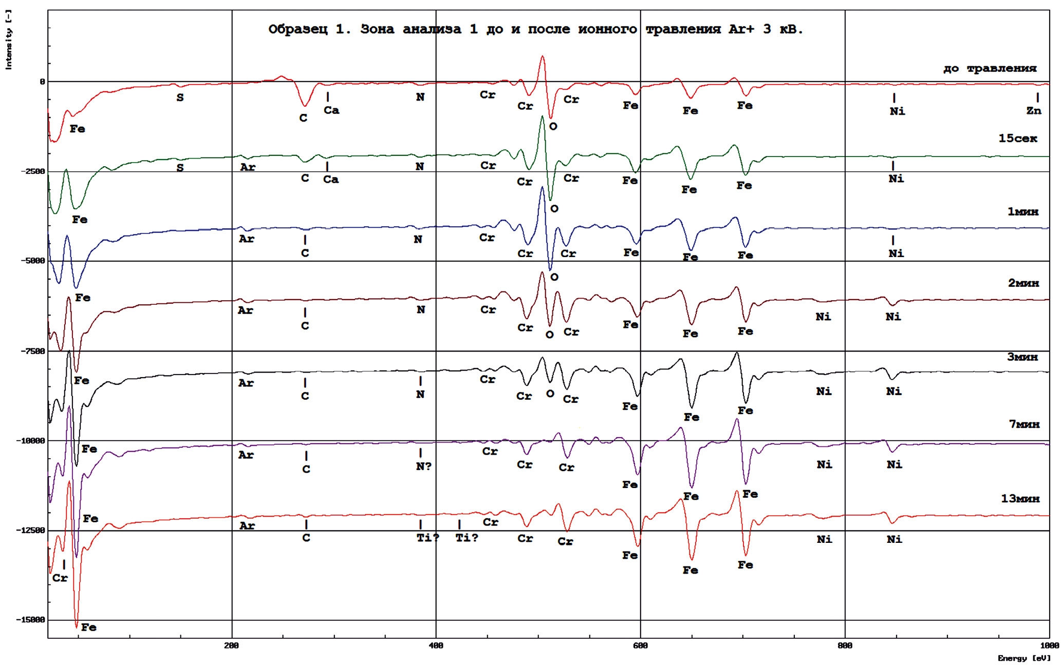 Элементный состав поверхности в зоне анализа № 1, неповрежденная поверхность образца после 3 мин ионного травления Ar+ 3 кВ (в порядке убывания амплитуды оже-пиков) – Fe, Cr, Ni и Ti, элементы, соответствующие составу нержавеющей стали 12Х18Н10Т. Азот N исчез на 3 мин ионного травления Ar+ 3 кВ, что соответствует глубине (оценочно) ~15 нм.