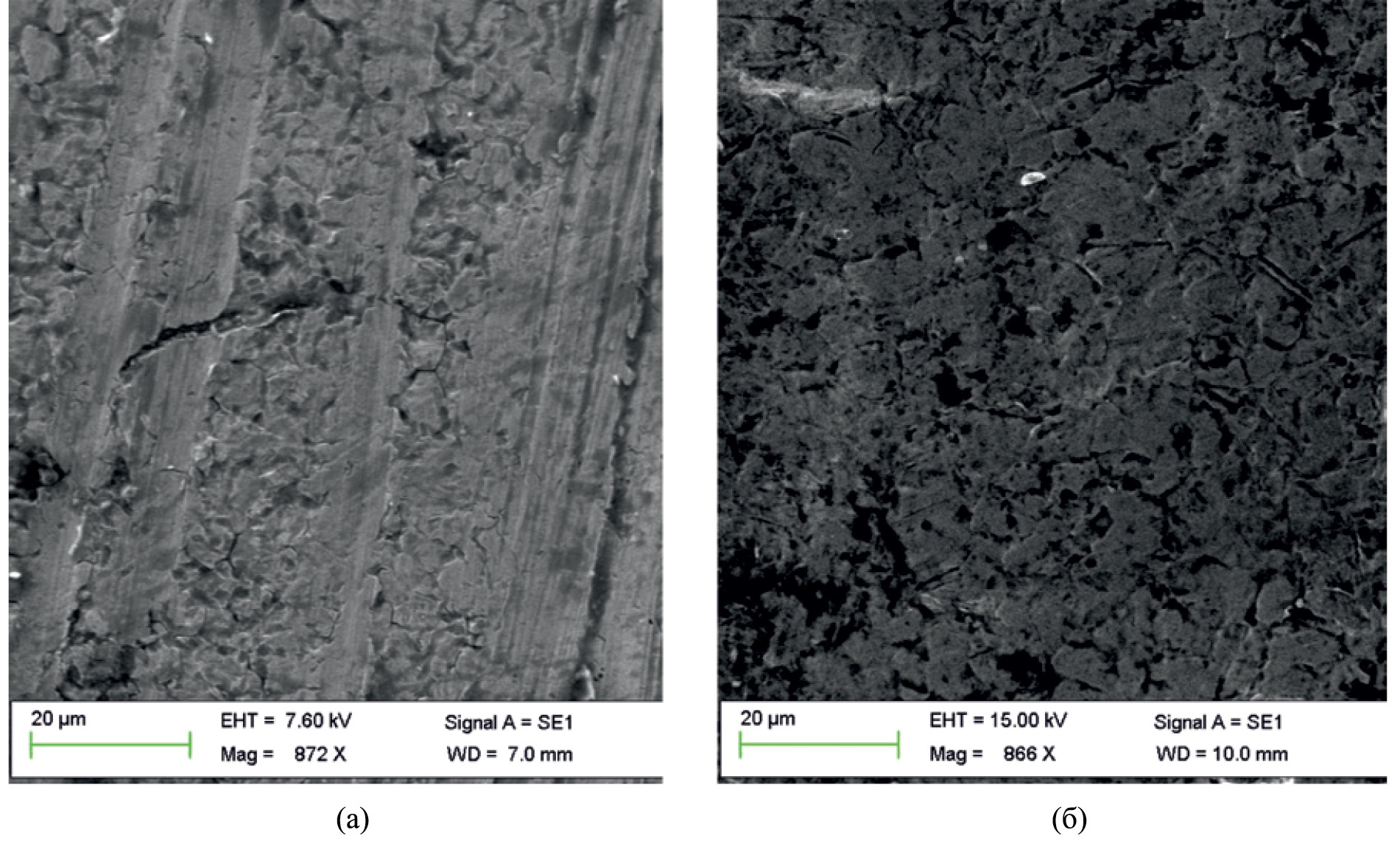 Рис. 2. СЭМ-изображения поверхностей образцов до коррозионных испытаний: (а) — контрольный образец, (б) — обработанный в низкотемпературной плазме с наложением переменной составляющей.
