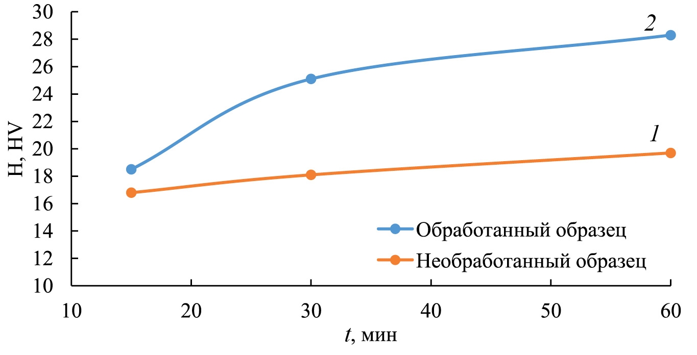 Рис. 3. Изменения при испытаниях на микротвердость: 1 — эталон-образец, 2 — обработанный в низкотемпературной плазме.