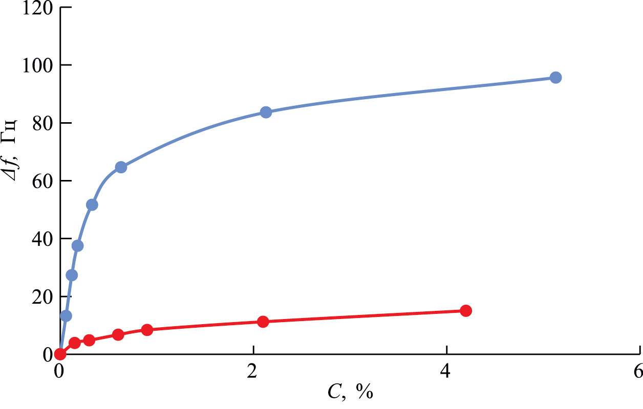 где Δf(C) = f(C) – f0 – изменение частоты f в результате адсорбции ГА с концентрацией С, f(C) и m(C) – соответственно частота сенсора и масса адсорбента в среде с адсорбатом.