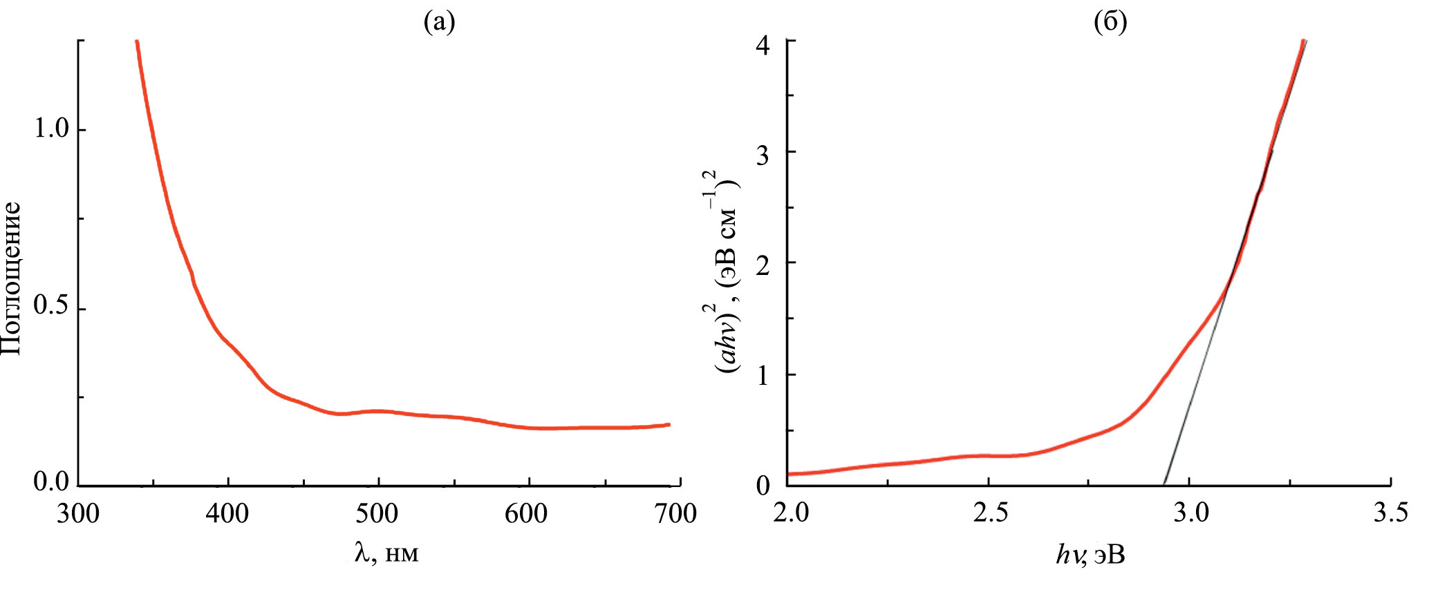 Спектры поглощения исходных пленок WO3 представлены на рис. 2 (где λ – длина волны монохроматического света). Ширина запрещенной зоны электроосажденных пленок оценивалась в координатах Tauc [(αhν)2, hν] (α – коэффициент поглощения, h – постоянная Планка, ν – частота света) (см. рис. 2б). Прямую запрещенную зону полупроводника (Eg) можно получить экстраполяцией линейной части функции (αhν)2 на ось X (энергия фотона hν). Как видно из рис. 2б, энергия запрещенной зоны для исследованных образцов Eg близка к 2.9–2.93 эВ.
